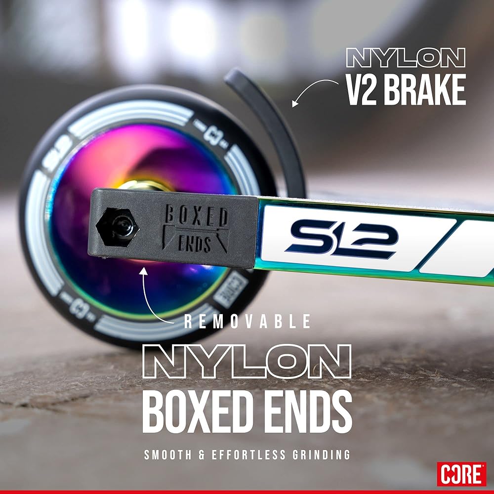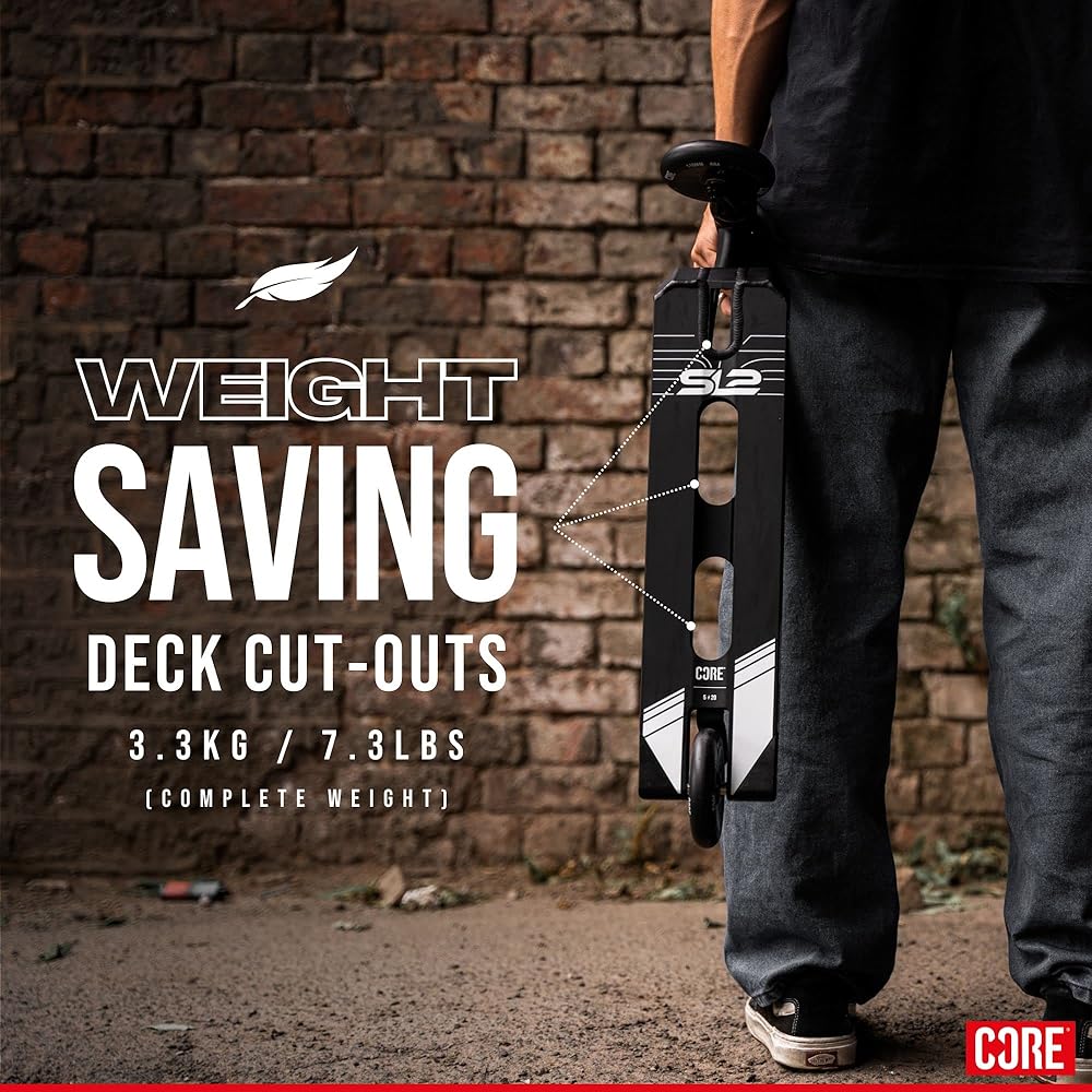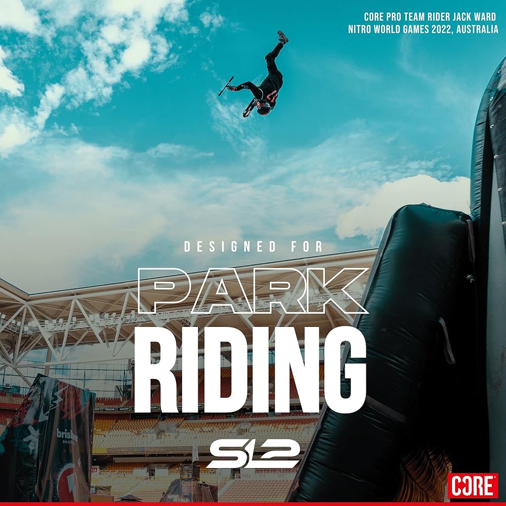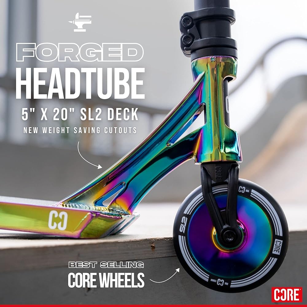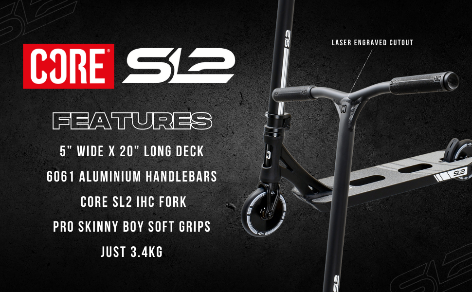 CORE is very proud to introduce our first complete stunt scooter, the SL1! After creating some of the most in-demand scooter parts on the market the next logical step for us to take producing our own complete scooters. We didn't rush this process, it's been 2 years in the making to perfect our design and manufacturing, we couldn't be happier with the final result. The CORE SL1 complete scooter is designed with skatepark riders in mind. Engineered from the ground up to be one of the lightest stunt scooters on the market you're about to unlock all those tricks you've been trying at your local skatepark! Constructed from 6061 Aluminum (the stuff they make space ships from) you know it's going to be super strong and light. Every aspect of this scooter has been custom designed by us with the sole purpose of skatepark riding. The SL scooter comes fully loaded with CORE premium aftermarket parts which are available in a variety of colors from your favorite scooter shop. CORE SL1 SCOOTER DECK The SL1 Deck features a lightweight design to help increase riding performance. With 4 weight-saving cutouts across the center of the deck. A flush blunt plate for easier slides on those nose blunts and grinds. A reinforced drop-out insert with integrated bolt groove to hold the rear axel meaning you only need one Allen key to tighten your scooter. CORE DUAL NYLON BRAKE SL1 decks also feature a CORE Dual Scooter Brake which is made from a super-strong Nylon material that covers the brakes metal skeleton for extra strength. Compatible with both 110mm and 120mm wheels using our unique rockered bolt design. You can quickly and easily change your brake to fit your scooter wheel size with just one bolt. CORE SL1 IHC FORK Super light, super strong the CORE SL1 IHC Fork. Cold forged for extra strength with an integrated axel design built into the fork you only need one 6mm Allen key to tighten your wheels making it super easy to maintain. CORE SL1 ALUMINIUM BAR 620MM CRE-6061 Aluminum Scooter bars ensure a lightweight but strong bar for skatepark riding. Tested by the CORE Pro Team with everything they could throw at it. The SL bar has been reinforced with gussets welded to the downtube to increase strength from the pressure created whilst landing tricks. CORE PRO SOFT GRIPS 170MM Our best selling CORE handlebar grips come as standard on the SL1 Scooter. Made from our custom super soft TPU compound that gets even comfier on your hands with time. 170mm in length ensures the perfect grip length for maximum comfort and shock absorbing whilst riding your scooter. CORE HOLLOW 110MM WHEELS Another one of our best selling and most in demand wheels comes as standard on the SL1 scooter. Lightweight, strong and reliable. Made from our tried and tested PU compound paired with our iconic red bearings you can't go wrong. CORE SL DOUBLE BOLT CLAMP Weighing in at just 91g (with bolts) the SL Double Bolt Clamp holds the scooter together with 6mm bolts. Made from Aluminium 6061 Cold Forged and CNC'D to shave off that extra bit of weight. SKILL LEVEL The CORE SL1 Stunt Scooter has been designed for Intermediate to advanced scooter riders with a focus on skatepark riding. This scooter has been tested and approved by the CORE Pro Team. Available in 3 colours as a complete scooter Black, Neo Chrome/Black, and Neo Gold/Black.