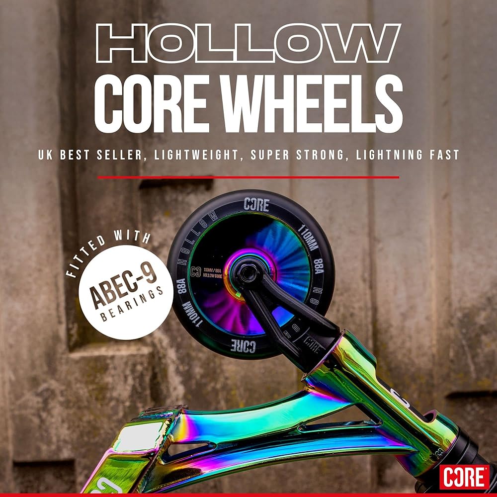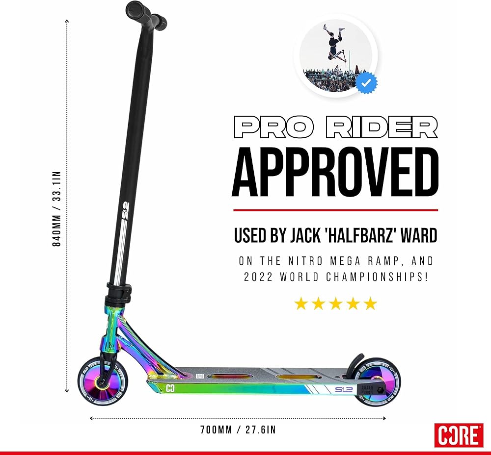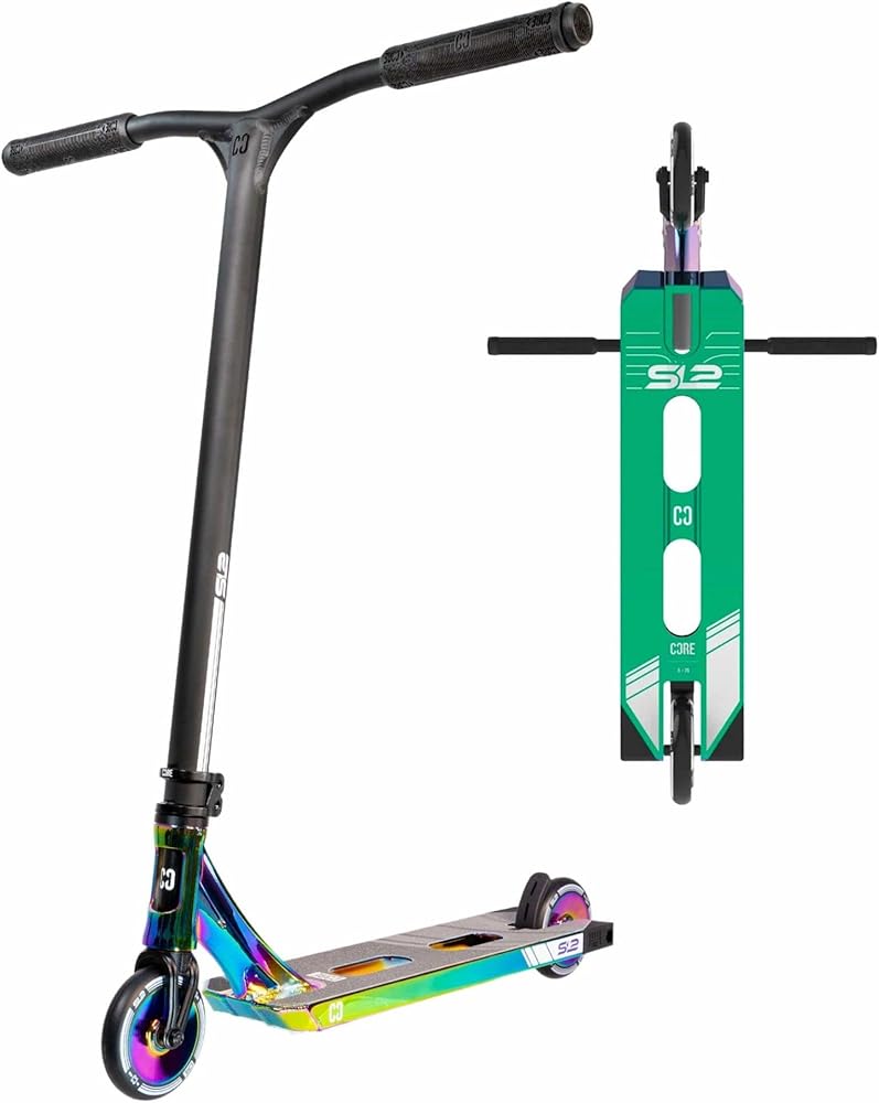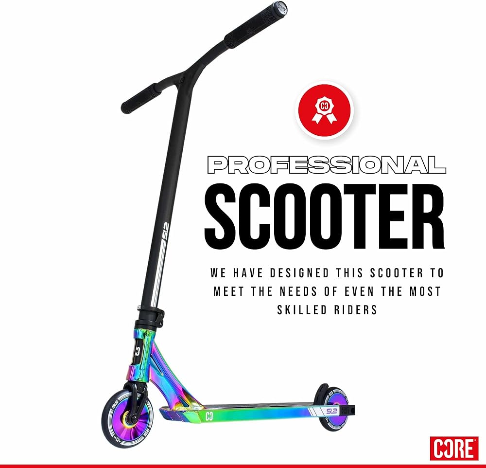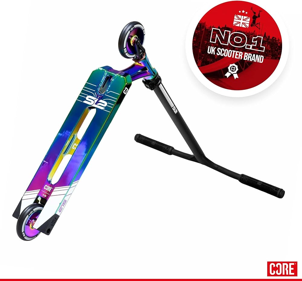CORE is very proud to introduce our first complete stunt scooter, the SL1! After creating some of the most in-demand scooter parts on the market the next logical step for us to take producing our own complete scooters. We didn't rush this process, it's been 2 years in the making to perfect our design and manufacturing, we couldn't be happier with the final result. The CORE SL1 complete scooter is designed with skatepark riders in mind. Engineered from the ground up to be one of the lightest stunt scooters on the market you're about to unlock all those tricks you've been trying at your local skatepark! Constructed from 6061 Aluminum (the stuff they make space ships from) you know it's going to be super strong and light. Every aspect of this scooter has been custom designed by us with the sole purpose of skatepark riding. The SL scooter comes fully loaded with CORE premium aftermarket parts which are available in a variety of colors from your favorite scooter shop. CORE SL1 SCOOTER DECK The SL1 Deck features a lightweight design to help increase riding performance. With 4 weight-saving cutouts across the center of the deck. A flush blunt plate for easier slides on those nose blunts and grinds. A reinforced drop-out insert with integrated bolt groove to hold the rear axel meaning you only need one Allen key to tighten your scooter. CORE DUAL NYLON BRAKE SL1 decks also feature a CORE Dual Scooter Brake which is made from a super-strong Nylon material that covers the brakes metal skeleton for extra strength. Compatible with both 110mm and 120mm wheels using our unique rockered bolt design. You can quickly and easily change your brake to fit your scooter wheel size with just one bolt. CORE SL1 IHC FORK Super light, super strong the CORE SL1 IHC Fork. Cold forged for extra strength with an integrated axel design built into the fork you only need one 6mm Allen key to tighten your wheels making it super easy to maintain. CORE SL1 ALUMINIUM BAR 620MM CRE-6061 Aluminum Scooter bars ensure a lightweight but strong bar for skatepark riding. Tested by the CORE Pro Team with everything they could throw at it. The SL bar has been reinforced with gussets welded to the downtube to increase strength from the pressure created whilst landing tricks. CORE PRO SOFT GRIPS 170MM Our best selling CORE handlebar grips come as standard on the SL1 Scooter. Made from our custom super soft TPU compound that gets even comfier on your hands with time. 170mm in length ensures the perfect grip length for maximum comfort and shock absorbing whilst riding your scooter. CORE HOLLOW 110MM WHEELS Another one of our best selling and most in demand wheels comes as standard on the SL1 scooter. Lightweight, strong and reliable. Made from our tried and tested PU compound paired with our iconic red bearings you can't go wrong. CORE SL DOUBLE BOLT CLAMP Weighing in at just 91g (with bolts) the SL Double Bolt Clamp holds the scooter together with 6mm bolts. Made from Aluminium 6061 Cold Forged and CNC'D to shave off that extra bit of weight. SKILL LEVEL The CORE SL1 Stunt Scooter has been designed for Intermediate to advanced scooter riders with a focus on skatepark riding. This scooter has been tested and approved by the CORE Pro Team. Available in 3 colours as a complete scooter Black, Neo Chrome/Black, and Neo Gold/Black.
