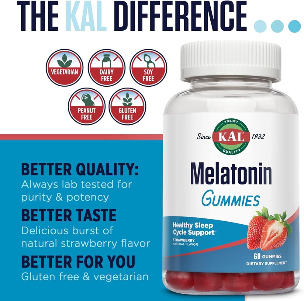 • صنع بشكل أفضل: علكات الميلاتونين من KAL نباتية، وخالية من منتجات الألبان، وخالية من الصويا، وشجرة الفول السوداني، وخالية من الغلوتين.