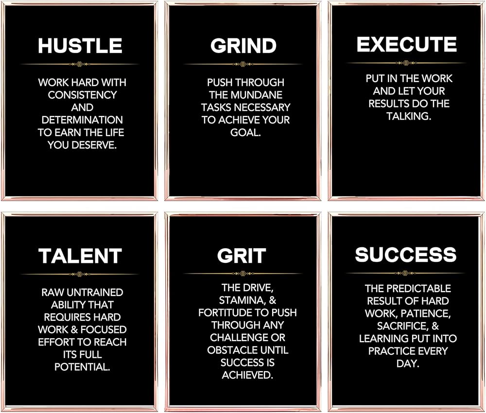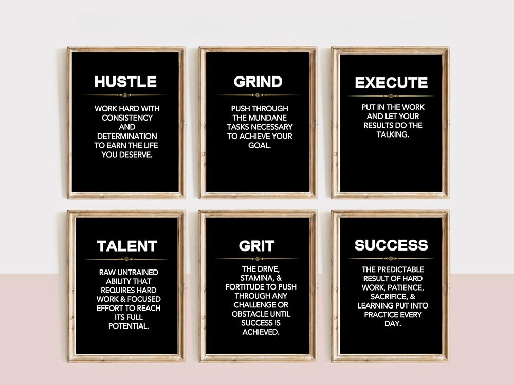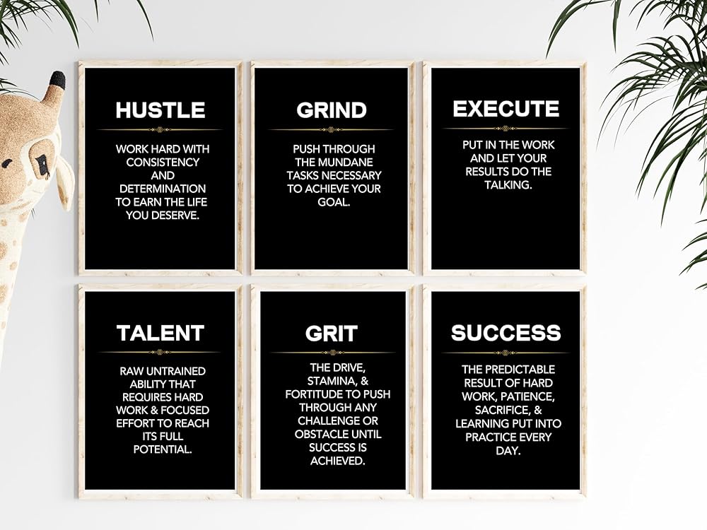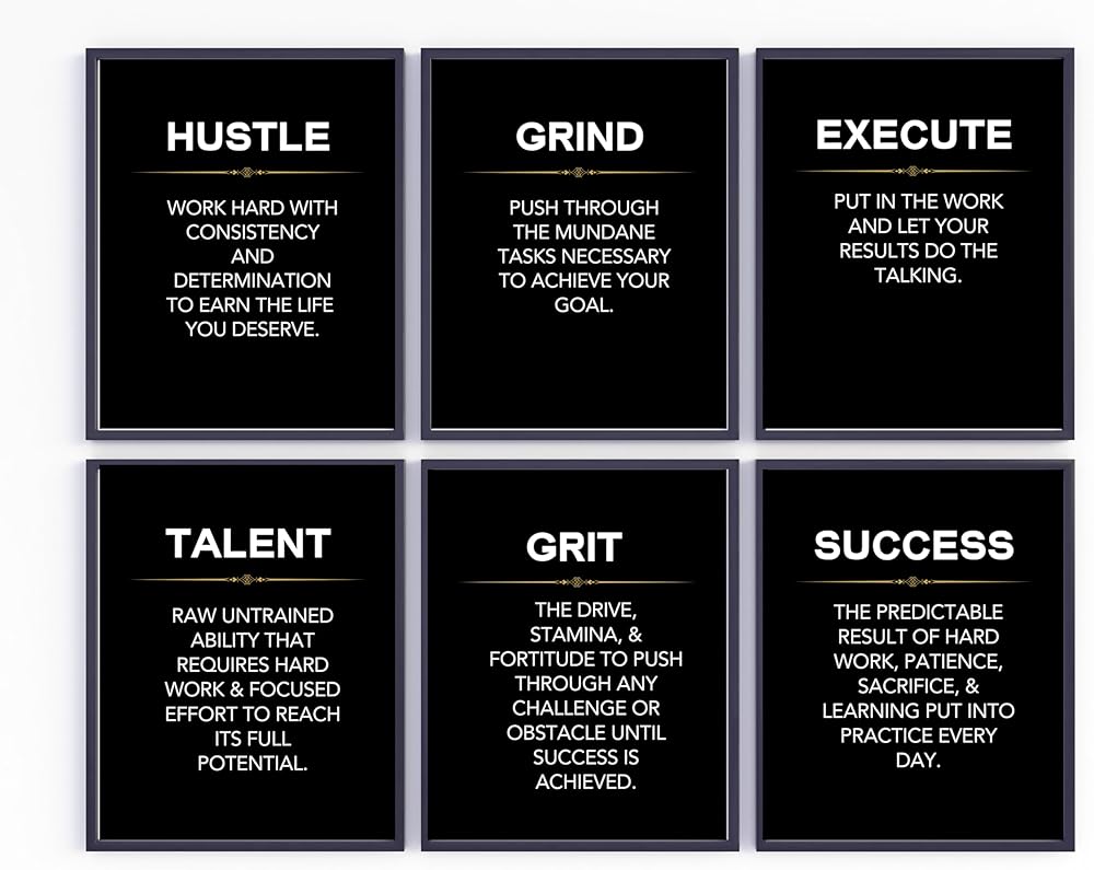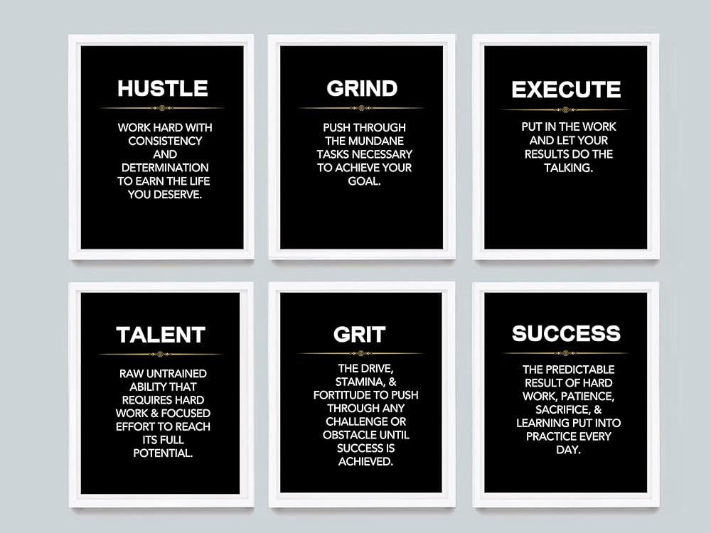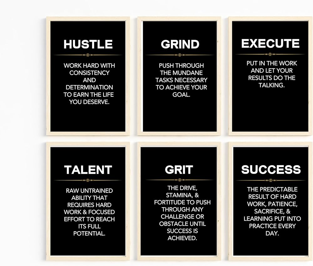 مجموعة كاملة من التحفيز: هذه المجموعة المكونة من ستة ملصقات تحفيزية هي دليل شامل لتحقيق النجاح في ريادة الأعمال. يركز كل ملصق على عنصر حاسم واحد: الطحن، والنشاط، والتنفيذ، والموهبة، والعزم، والنجاح.