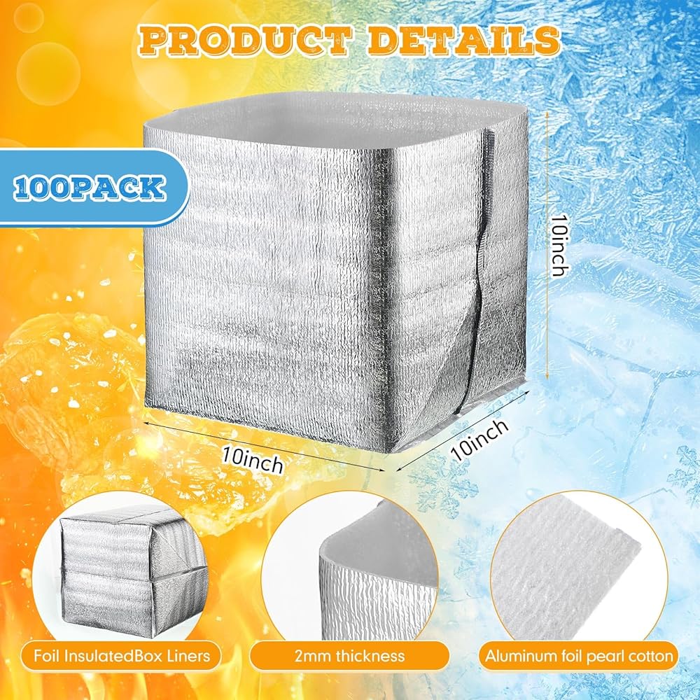 Sufficient Quantity and Proper Size: you will get 100 foil insulated box liners, so you have enough to meet your needs; They are sized at about 10 x 10 x 10 inches/ 25 x 25 x 25 cm, which makes them suitable for various containers and allows you to use them for different purposes; Whether you need to pack lunches, store temperature sensitive items, or transport goods, they are ideal; They are in bright silver color and have a smooth surface, and you can easily wipe them if the goods leak