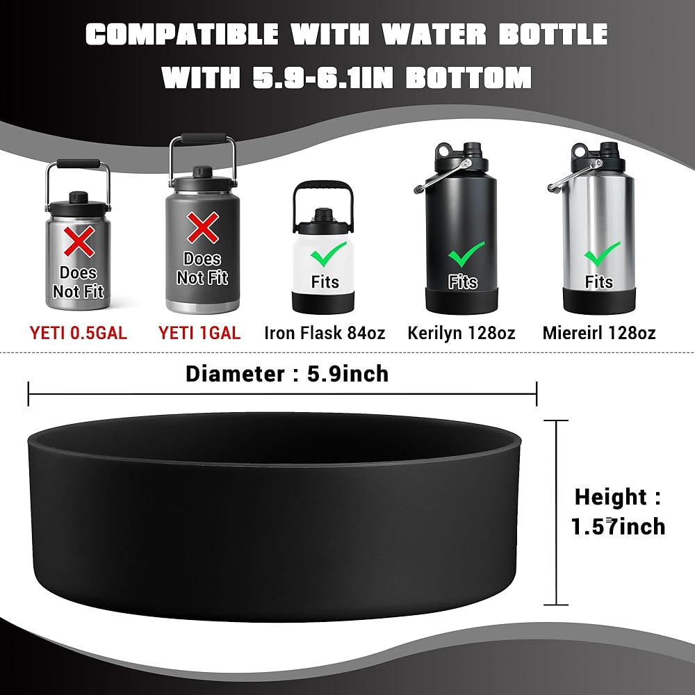 💎Compatible with:This boot fits perfectly on the bottom of the water bottle and is not easy to slip off. This silicone boot is compatible with Kerilyn One Gallon Jug, Miereirl 128oz Water Jug, Iron Flask 84oz Water Bottle and with same bottom width 5.9-6.1 inches of bottle. ⭐Kindly Remind:DOESN'T fit for Hydro Flask One Gallon Jug,YETI One Gallon Jug,YETI Half Gallon Jug,Iron Flask 128oz Jug.