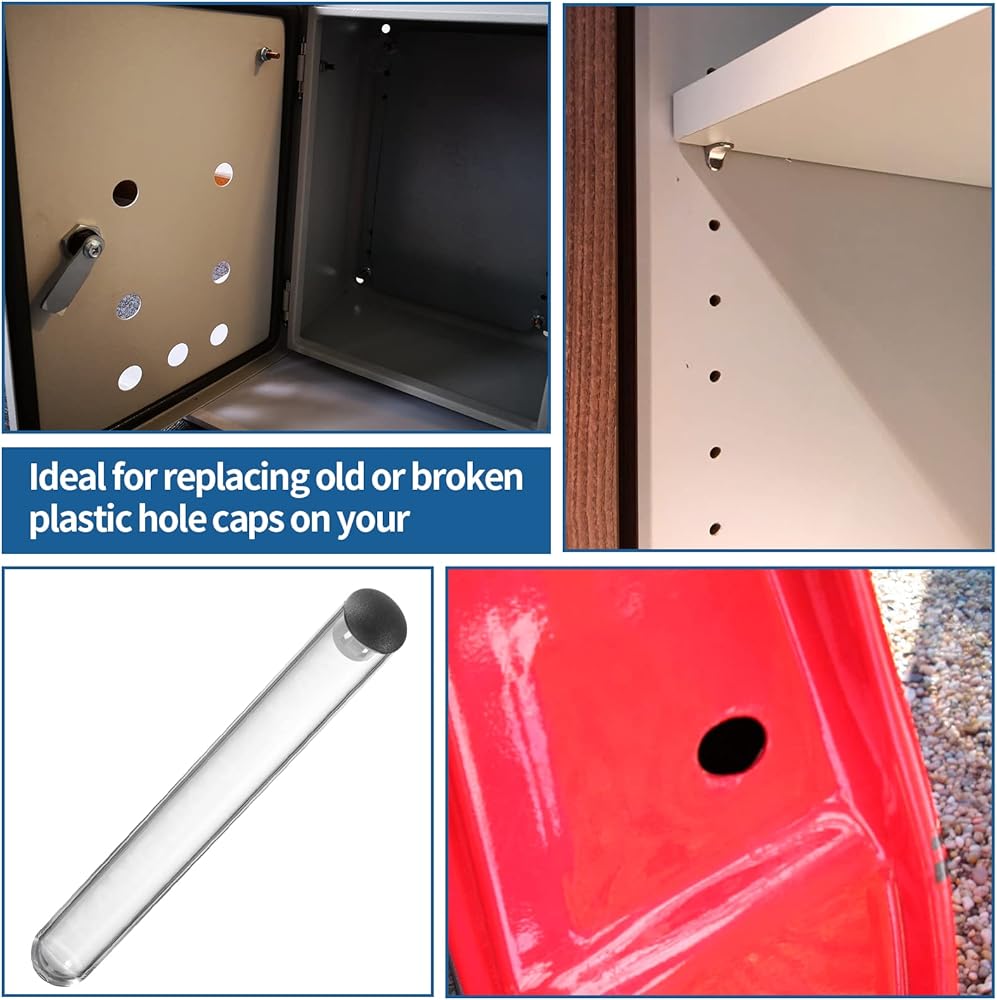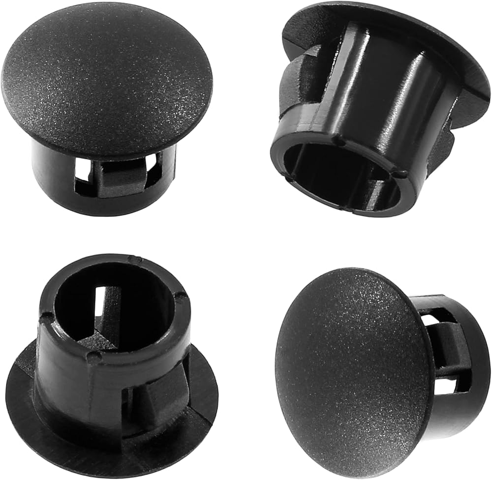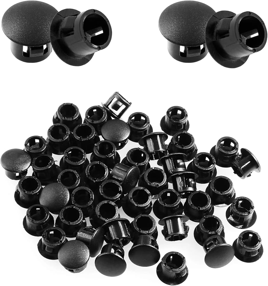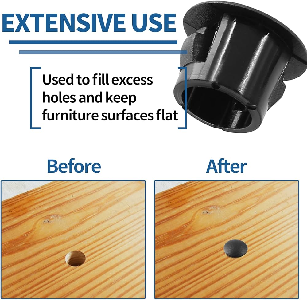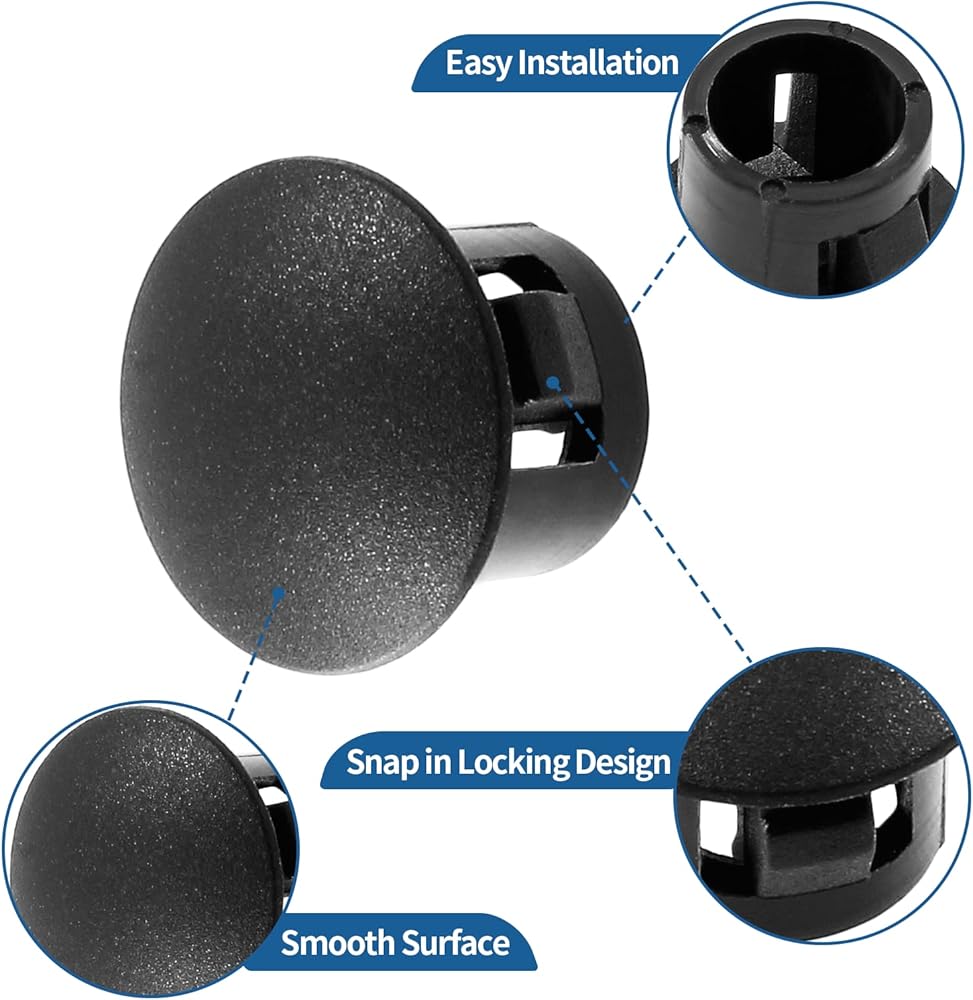 Round plastic plugs have a snap in locking design and can be installed with just a press, ideal for replacing old or broken plastic hole caps on your furniture.
