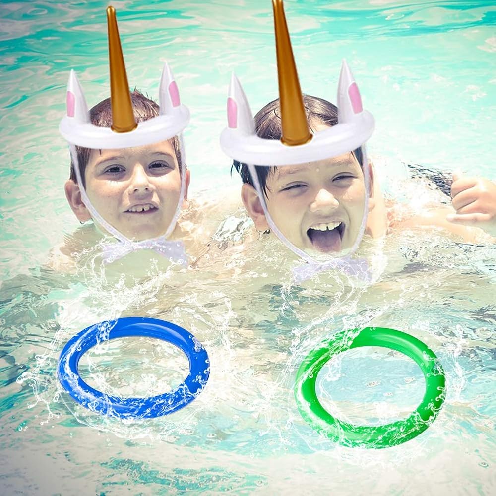جميلة وشعبية: قبعة وحيد القرن القابلة للنفخ من جوليو بيضاء على شكل أحادي القرن مع قرن أحادي القرن ذهبي. هناك 4 ألوان من الحلقات القابلة للنفخ: الأخضر والوردي والأصفر والأزرق. التصميم اللطيف والملون يحظى بشعبية لدى الأطفال والكبار على حد سواء.