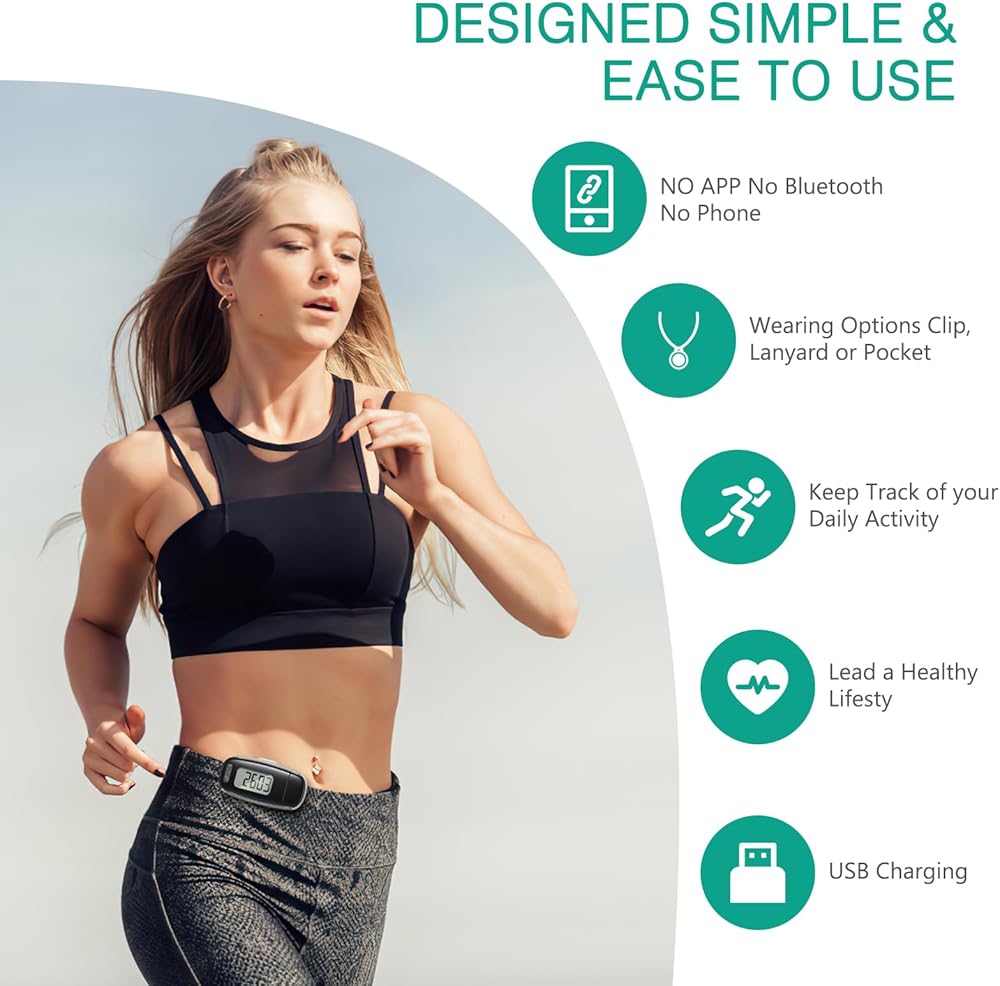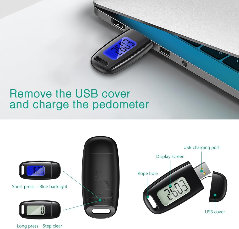 【تصميم بسيط وشحن USB 】لا يتطلب بلوتوث، تطبيق. لا يوجد سوى زر "إعادة تعيين" واحد. اضغط لفترة قصيرة لتشغيل الإضاءة الخلفية، واضغط مع الاستمرار لمدة 5 ثوانٍ لمسح عدد الخطوات. ما عليك سوى توصيل جهاز تعقب الخطوات القابل لإعادة الشحن بأي محول USB أو حتى بجهاز الكمبيوتر الخاص بك للشحن.