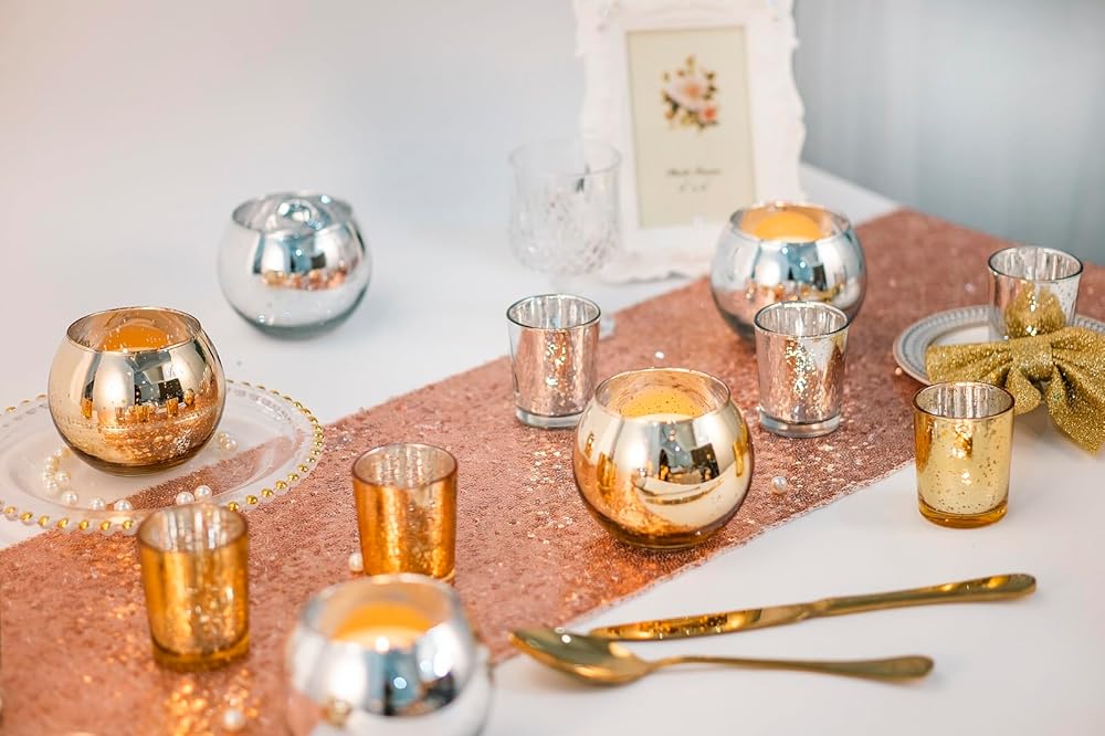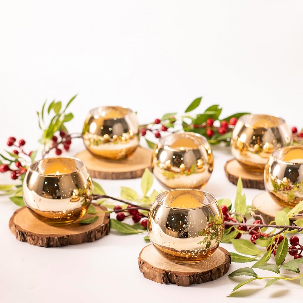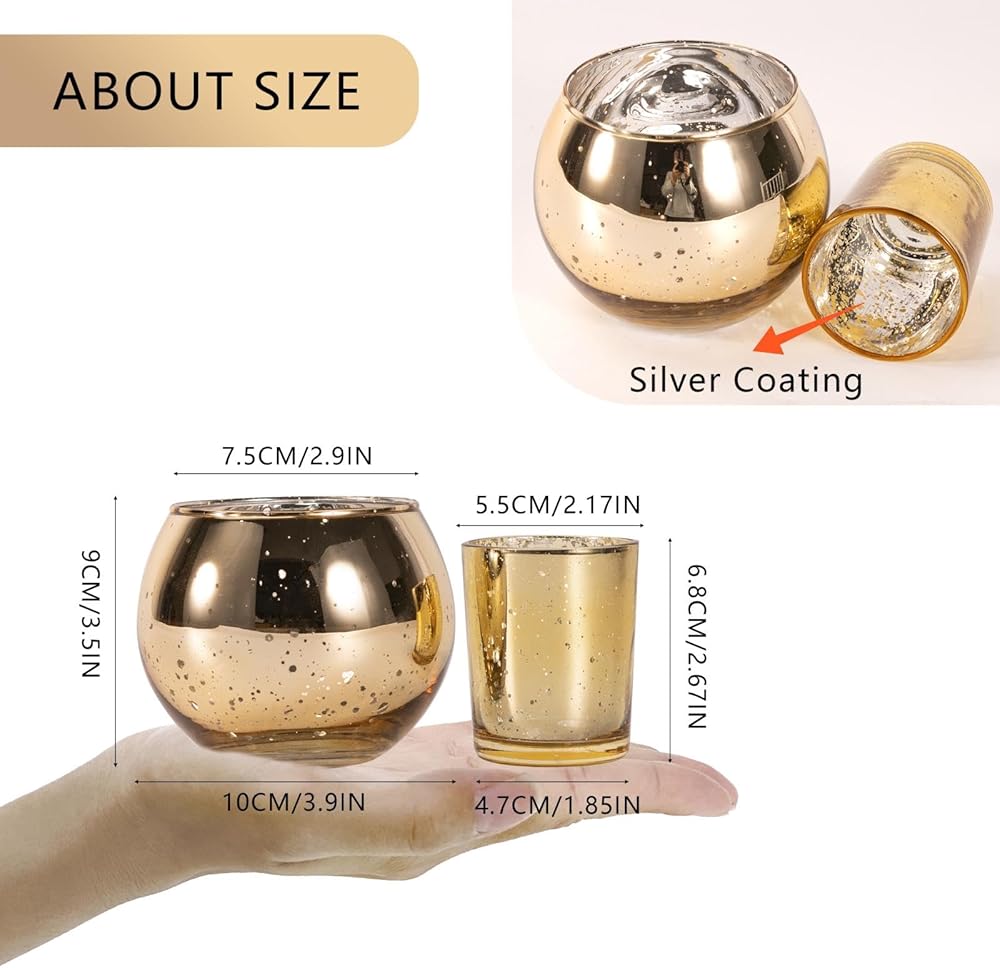 حاملات الشموع النذرية مصنوعة من عملية طلاء عالية الجودة. يضيف الطلاء الفضي الموجود داخل أكواب الشمع تألقًا إلى شموعك، كما يبدو الطلاء الخارجي أكثر تألقًا وملكية مع ضوء الشموع. مصنوعة من زجاج سميك خالٍ من الرصاص، وتتميز حاملات الشموع الذهبية بسطح خارجي أملس يضمن مقاومة فائقة للتآكل ومقاومة للتآكل.