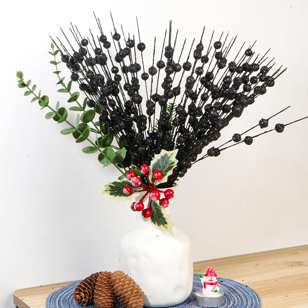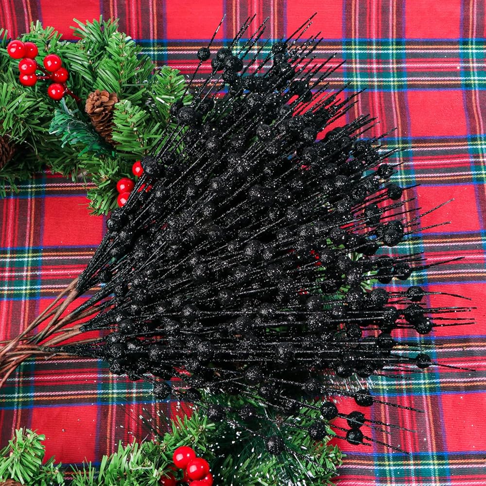 • Quantity: Each package contains 12PCS Glitter black Berry Picks Faux Berry Spray Branches Christmas Berry Stems black Berry Sprigs Twigs. They look lifelike, bright and attractive.