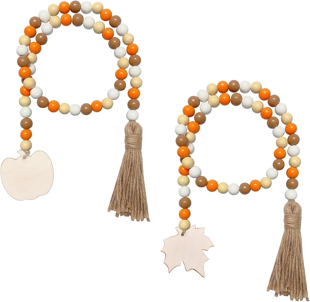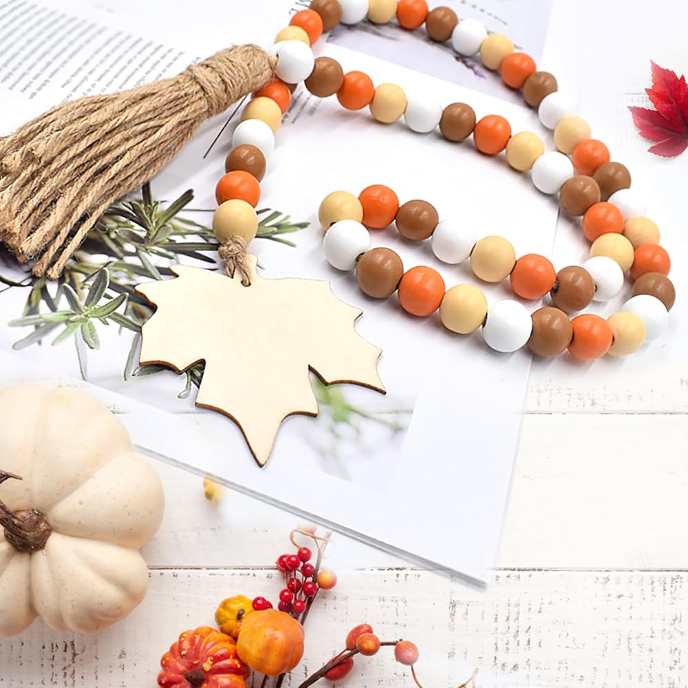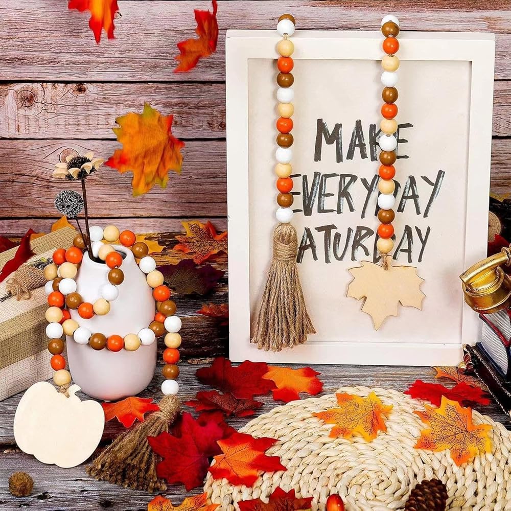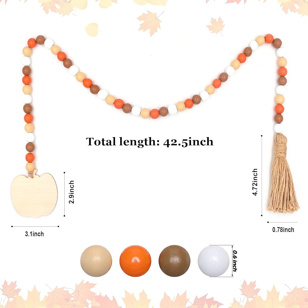 2 wooden bead garland tassels in 2 different designs. One is pumpkin style, and the other is maple leaf style; 42.5 inches in length, with 16 millimeters of beads. Wood beads come in four colors: white, yellow, pumpkin orange, and dark brown.