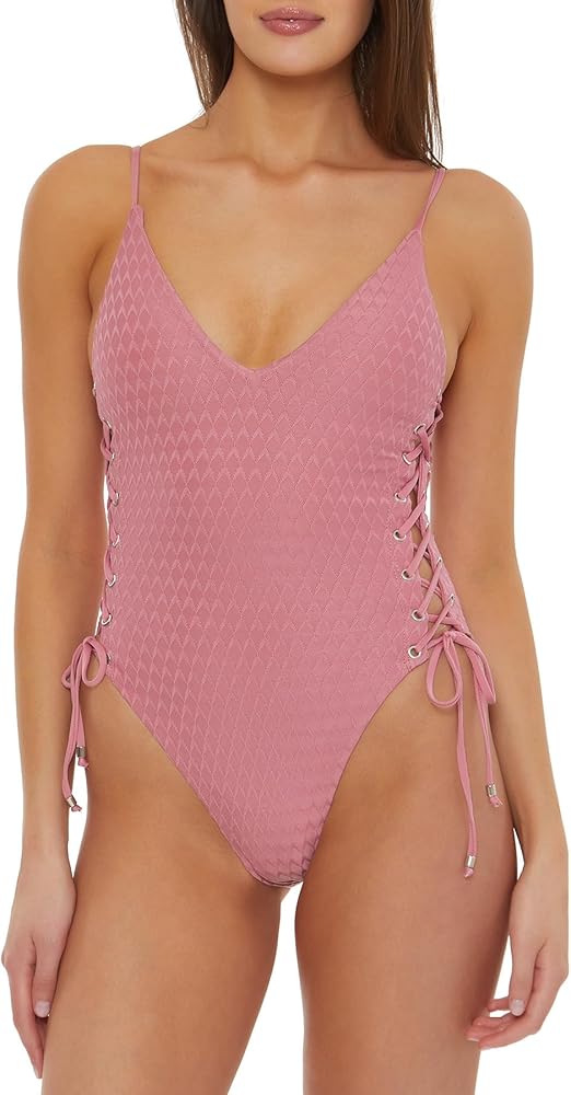 • [ Adjustable Spaghetti Corset ] – Featuring a unique, adjustable spaghetti corset with lace-up sides, silver eyelets, and beads, this swimsuit allows you to customize your fit while adding a fashionable touch.