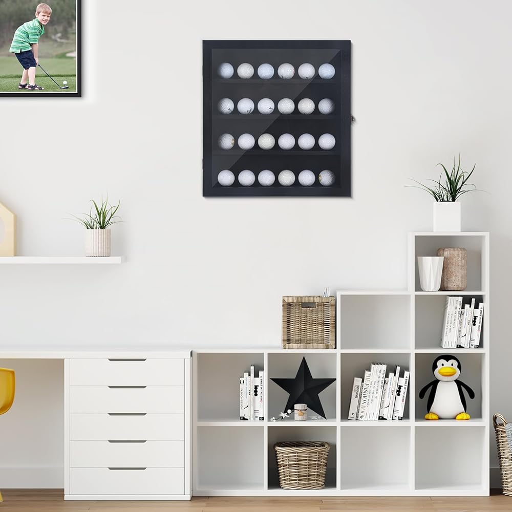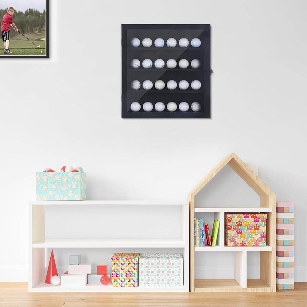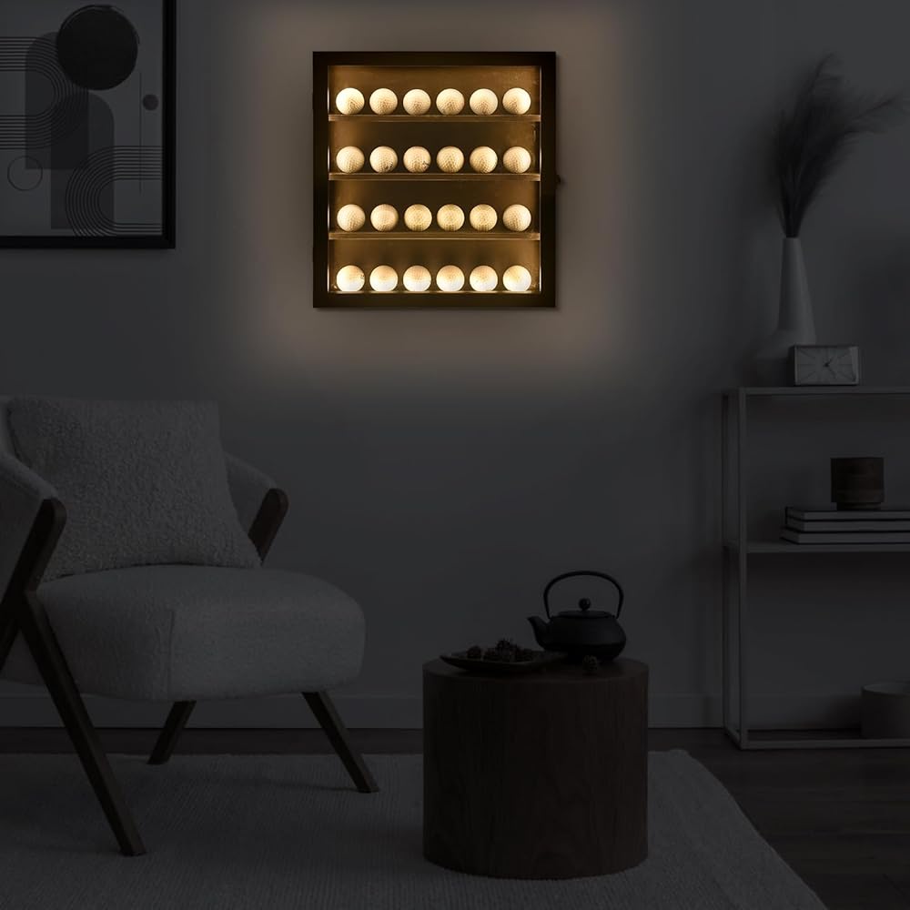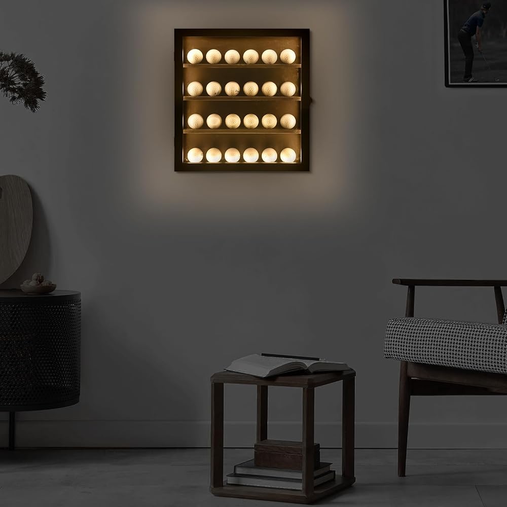 حافظة عرض كرة الجولف اللامعة: حافظة كرة الجولف مصنوعة من الخشب مع لوحة أكريليك شفافة مضادة للبهتان يمكنها حمل 24 كرة جولف. إنه صندوق ظل لامع مصمم حديثًا لتخزين وعرض كرات الجولف الموقعة. يتم تثبيته على الحائط، ومصباح LED المدمج يمكن أن يسلط الضوء على كرات الجولف العزيزة التي لا تنسى. (ملاحظة: الكرات غير متضمنة.)