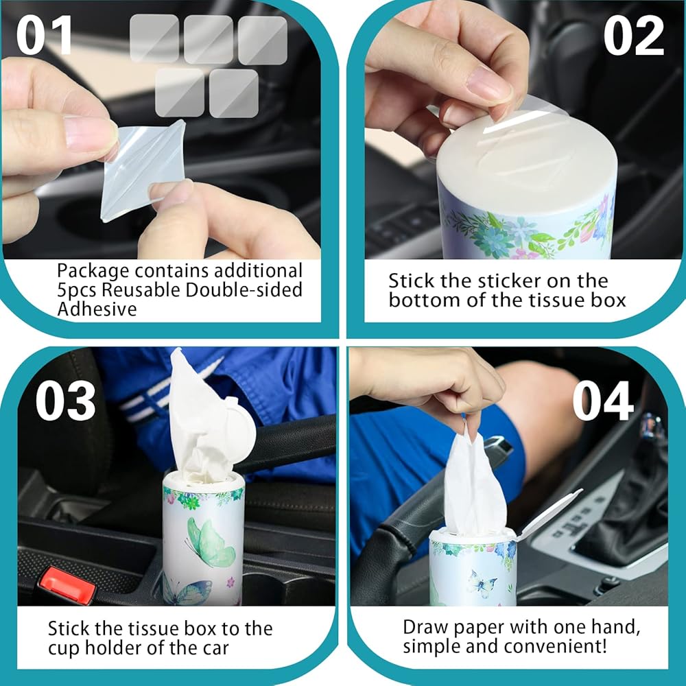 【About the Package】: Car tissue box includes 4 cans of tissues and 8 packs of refill tissues, which could greatly meet your needs. And at the same time, it also has 5 reusable and washable double-sided stickers, you can stick them on the bottom of tissues cube boxes, which can effectively protect from rolling
