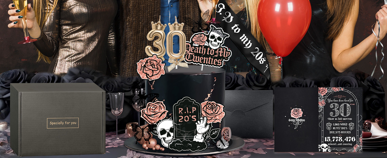 • 🦋 تصميم مذهل باللونين الأسود والوردي: يتميز موضوع "Death to My 20s" بتصميم فريد من نوعه باللونين الأسود والذهبي الوردي. تتضمن قطعة تزيين الكيك RIP 20s وبطاقة عيد الميلاد الثلاثين (مع ظرف) عناصر الفراشة والورد والجمجمة. الشموع الـ 30 مع تيجان القوس والبالونات السوداء الثلاثين تجعل ديكور عيد ميلادك الثلاثين مبهرًا!