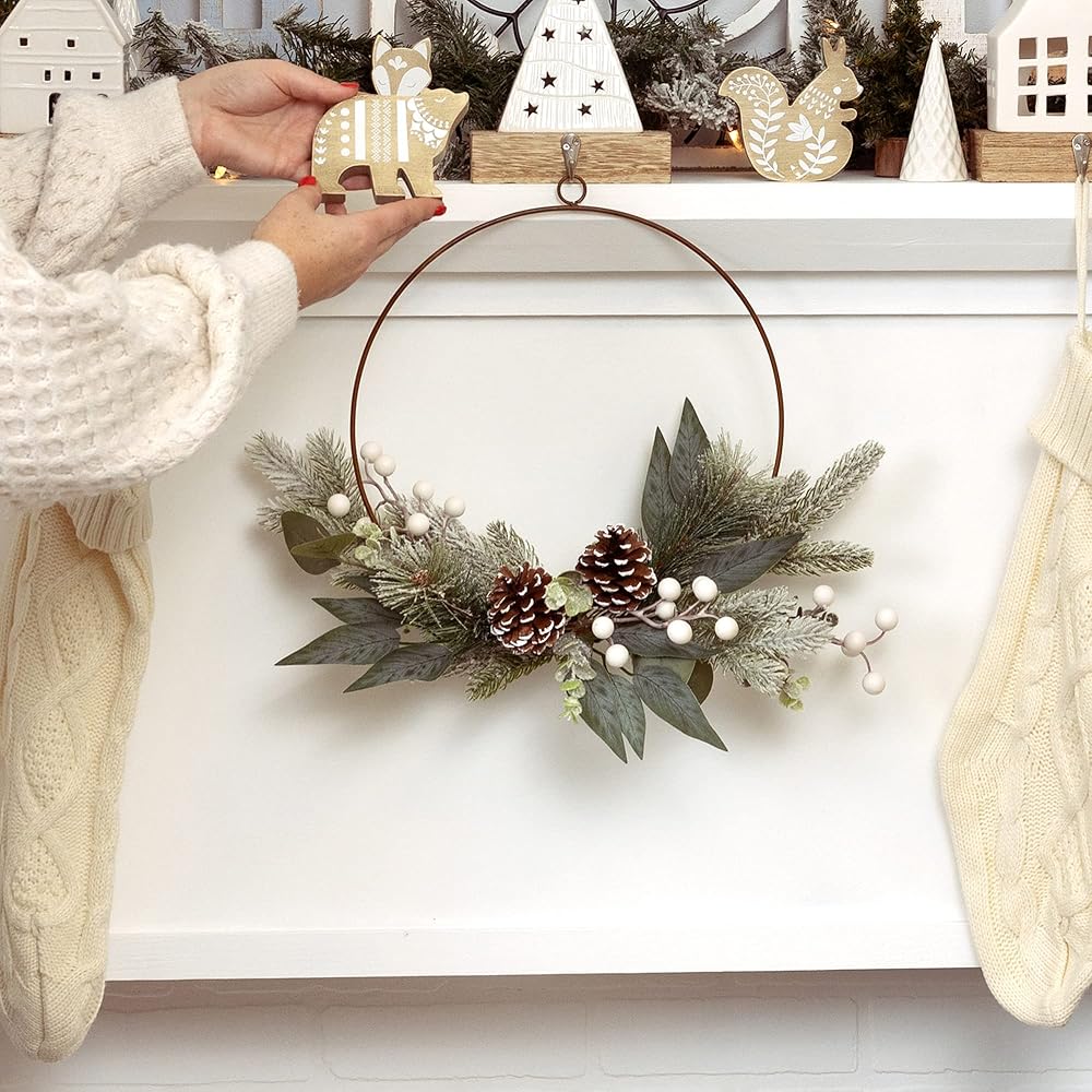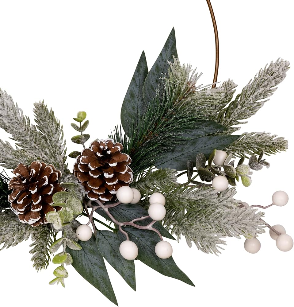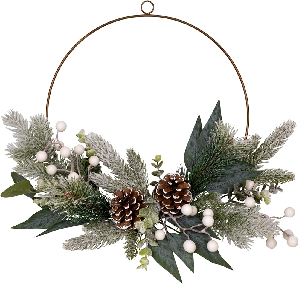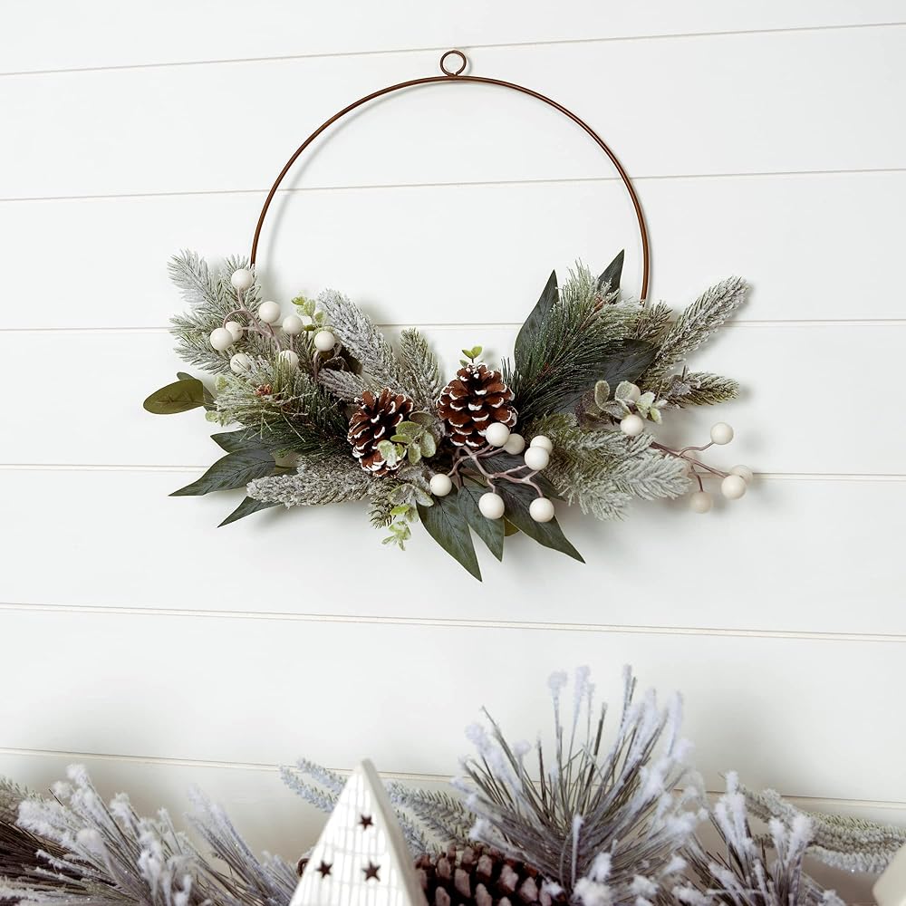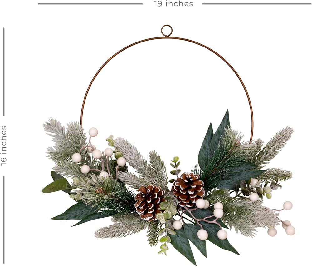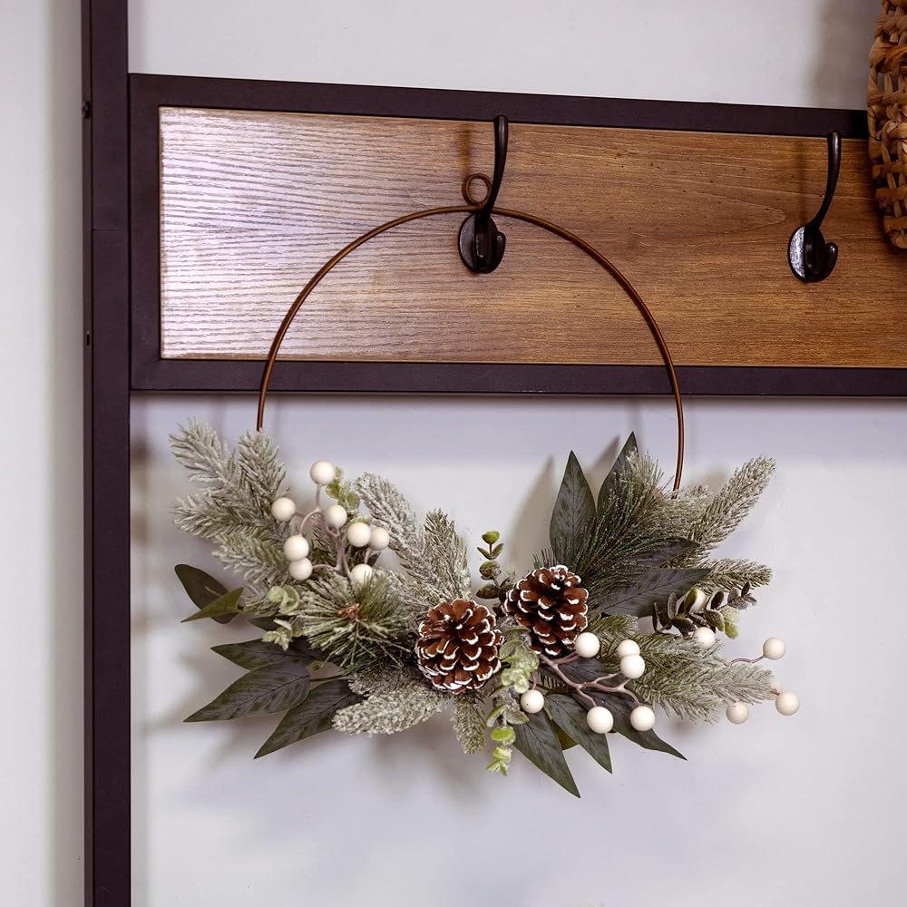 ديكور المنزل من ستراتون، نباتات شتوية خضراء مع التوت وأكواز الصنوبر، إكليل جداري، سهل التعليق، إكليل عيد الميلاد الداخلي الريفي للأبواب والجدران مع شماعة حلقة معدنية 3 بوصة × 19 بوصة × 16 بوصة