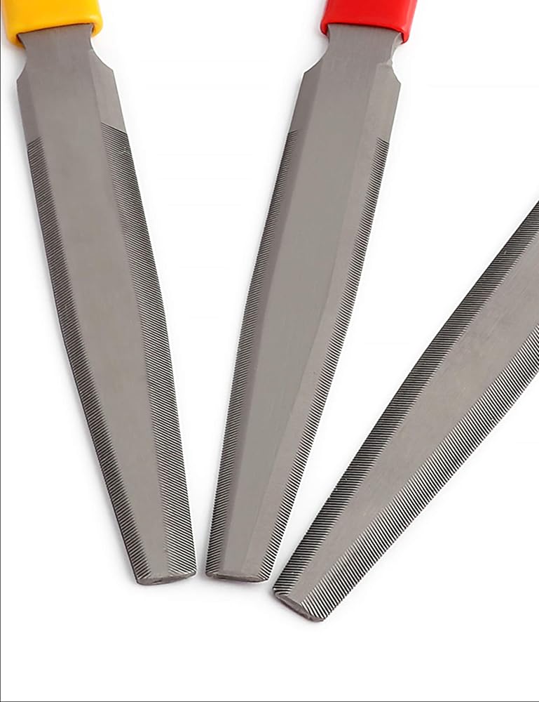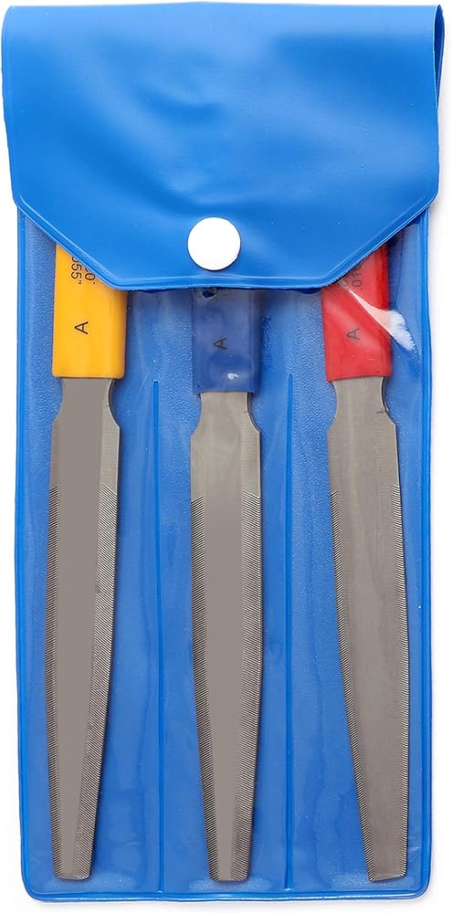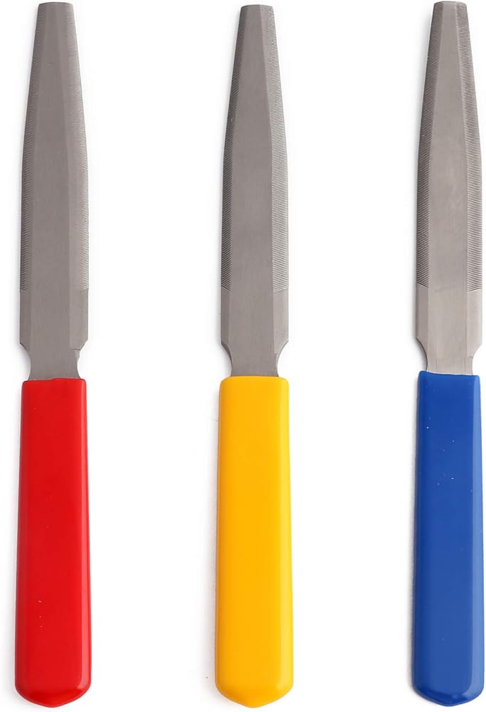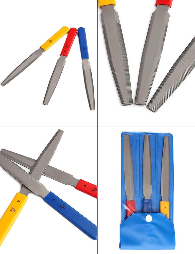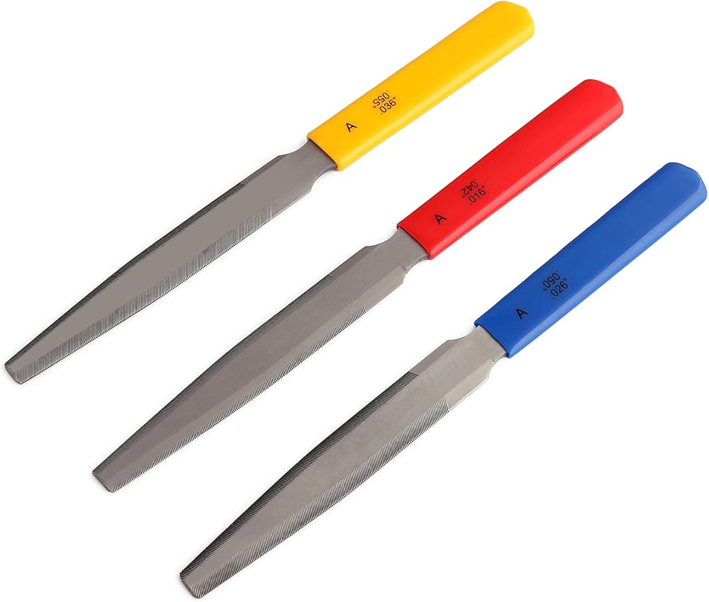 Excellent V shaped nut slotting file set for acoustic guitars, 3 double edge tapered edge cut files for cutting string grooves in nut.