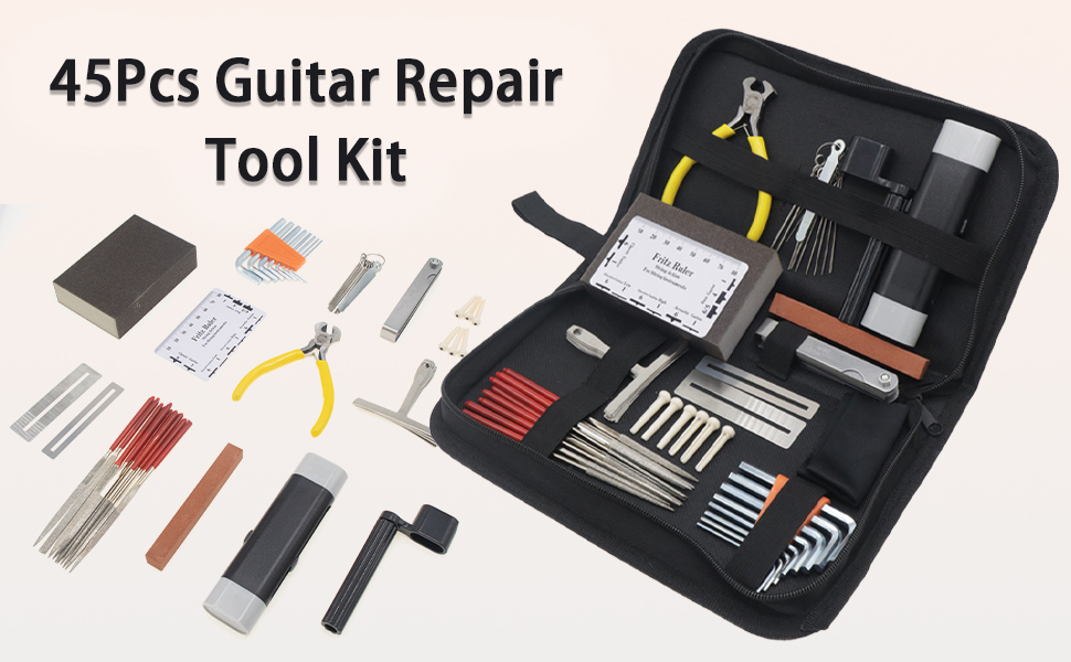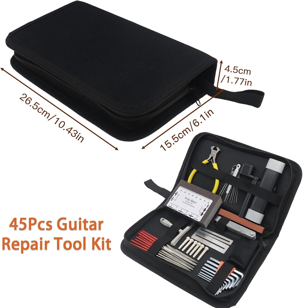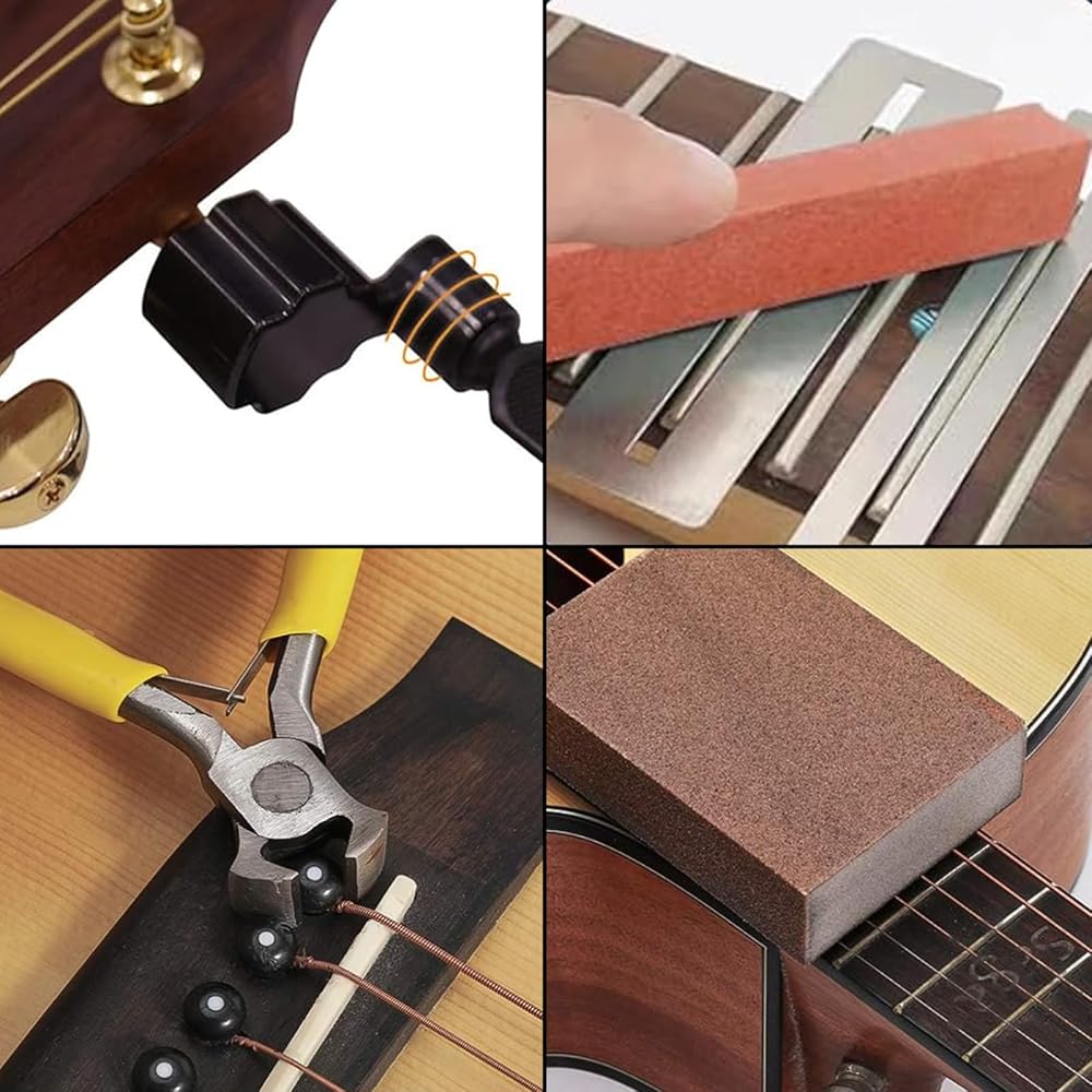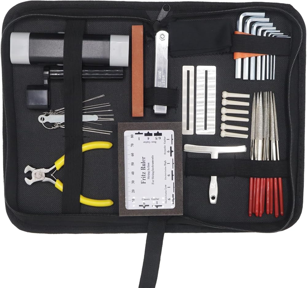 أدوات يجب اقتناؤها لعشاق الجيتار: جهز نفسك بالأدوات الأساسية للعناية بالجيتار وإصلاحه. تشتمل هذه المجموعة على مسطرة عمل خيطية وملفات تتويج الحنق وغيرها من الملحقات الأساسية لمساعدتك على معالجة المشكلات الشائعة والحفاظ على أدواتك في أفضل حالة لعب.