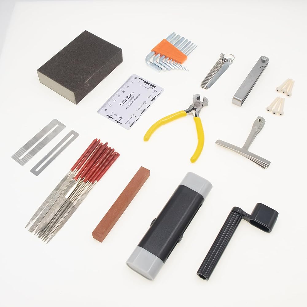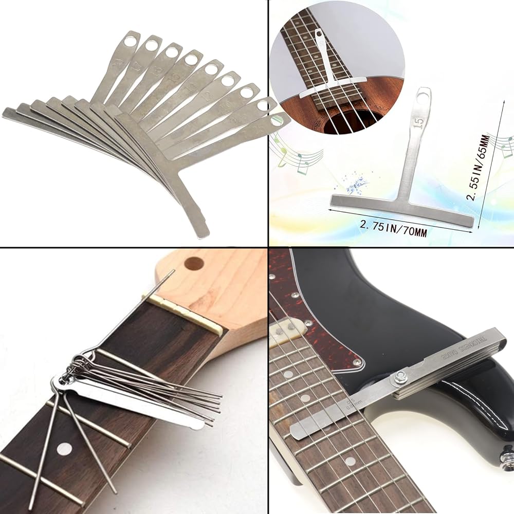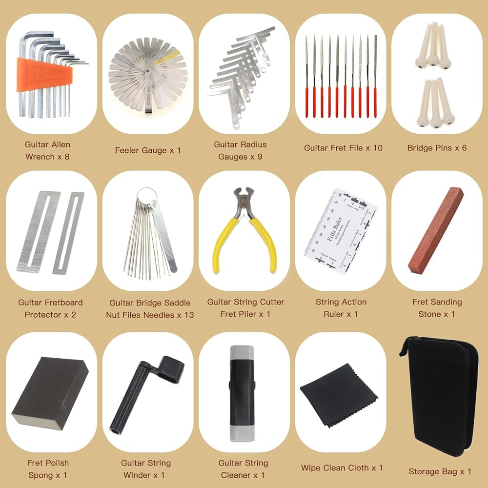 أدوات يجب اقتناؤها لعشاق الجيتار: جهز نفسك بالأدوات الأساسية للعناية بالجيتار وإصلاحه. تشتمل هذه المجموعة على مسطرة عمل خيطية وملفات تتويج الحنق وغيرها من الملحقات الأساسية لمساعدتك على معالجة المشكلات الشائعة والحفاظ على أدواتك في أفضل حالة لعب.