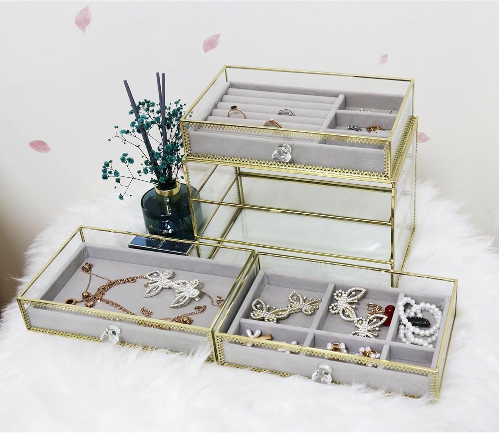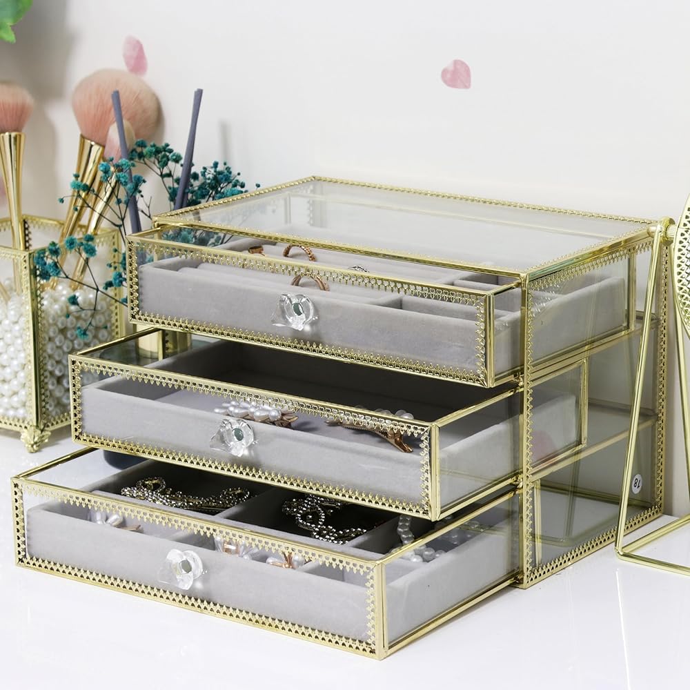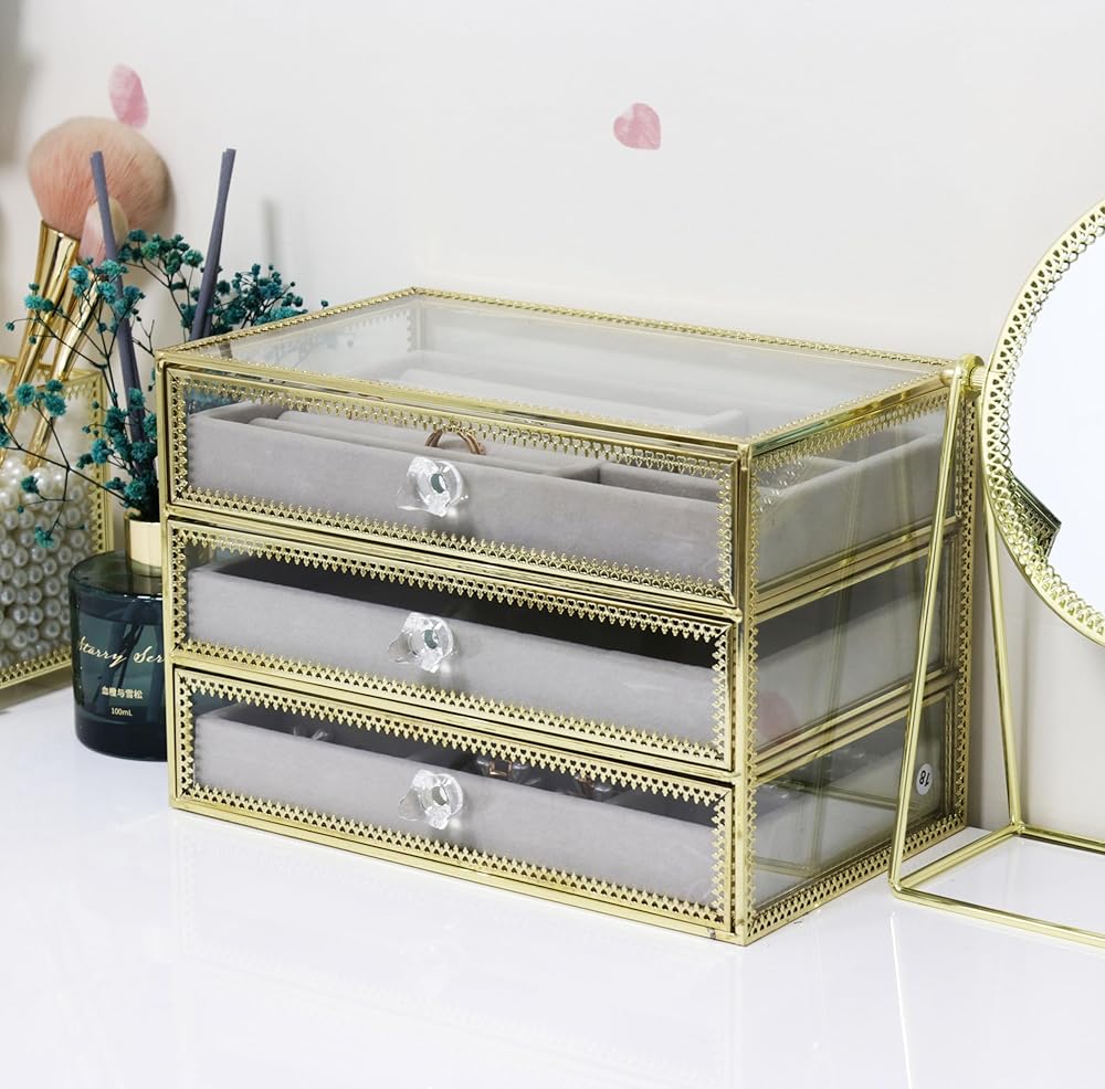 LUXURY LOOKING WITH BRASS & GLASS MATERIALS – Golden Brass pattern edge with clear glass makeup jewelry box. Antique luxury style. Robust and last for longer.