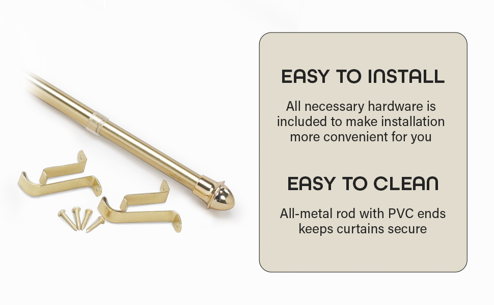 Sturdy Materials: The Fantasia Curtain Rod is an all-metal rod with PVC ends and a brass finish. It's easy to clean, simply dust or wipe with a damp cloth.