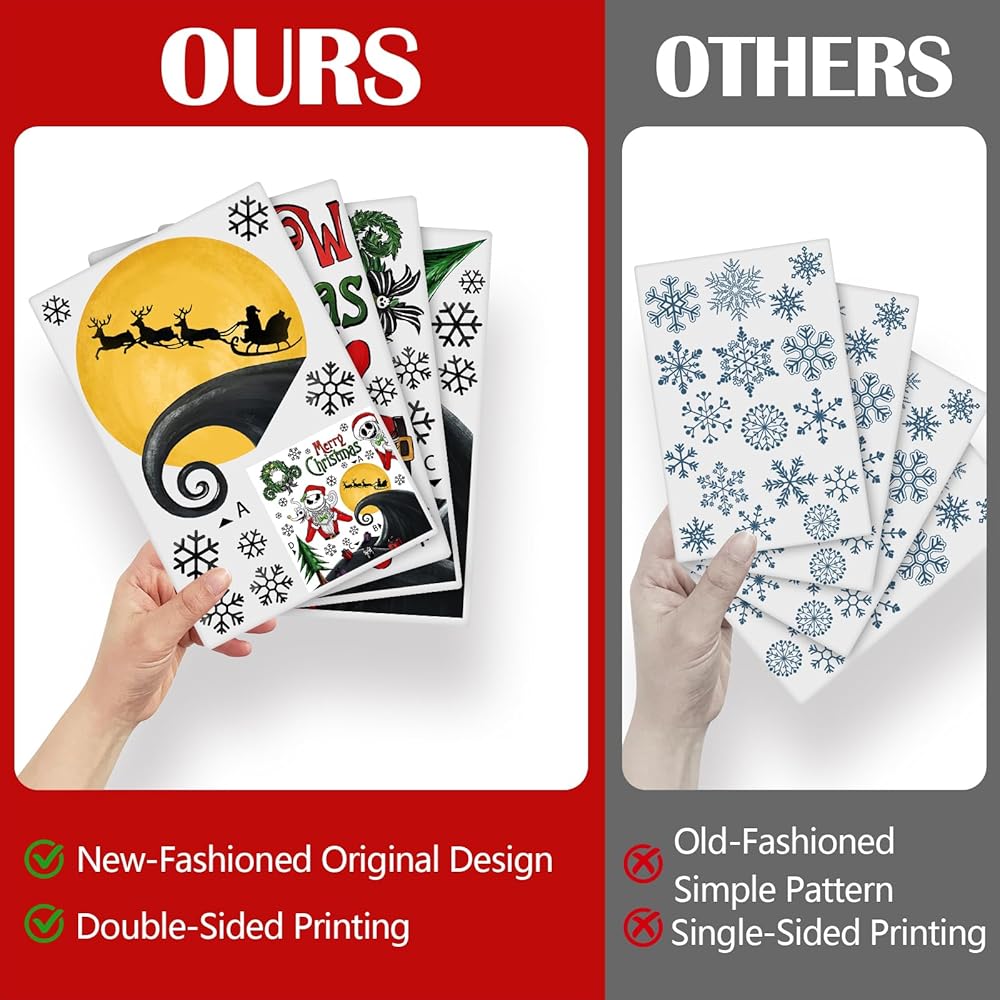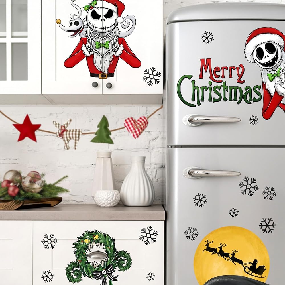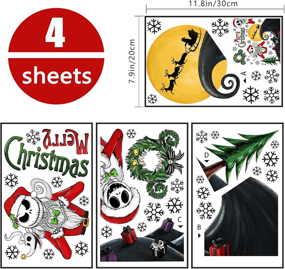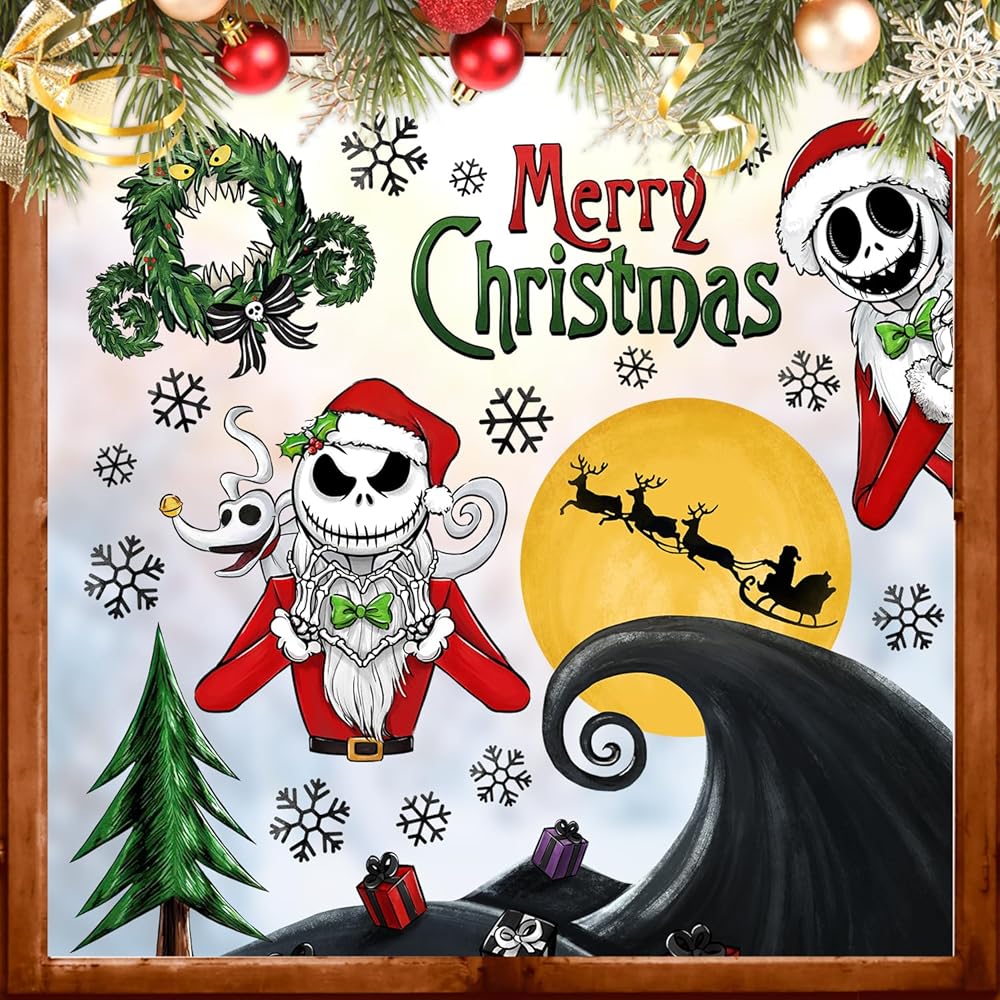 Yovkky 158 قطعة عيد ميلاد سعيد Nigh.tmar.e BEF.ore ملصقات نافذة عيد الميلاد، جاك سكلينجتون سانتا كلوز شجرة عيد الميلاد ملصقات ديكور، 2024 رأس السنة الجديدة عطلة الشتاء ديكورات المطبخ المنزلي