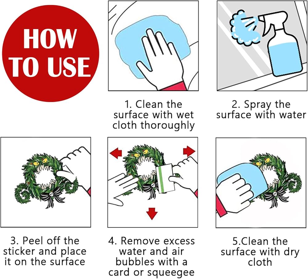 • ديكور منزلي بدون لاصق: ديكورات نوافذ عيد الميلاد هذه عبارة عن ملصقات ثابتة رفيعة، والتي لا تتطلب غراءًا أو شريطًا إضافيًا، ويمكن ربطها بسهولة بسطح أملس وجاف. ما عليك سوى إزالة ملصق النافذة ولصقه على سطح السيارات والشاحنات والزجاج والمرايا والنوافذ والأبواب الزجاجية المقاومة للتخريب وأسطح الحمامات؛ واستخدم بطاقة لإخراج فقاعات الهواء من الأعلى إلى الأسفل. من السهل تركيبها على نافذتك وإزالتها دون ترك بقايا لزجة