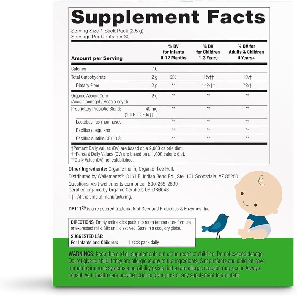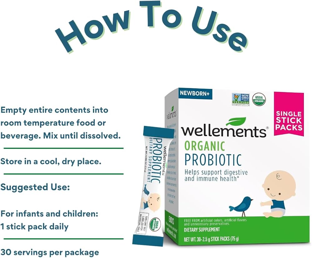 حزم عصا البروبيوتيك العضوية من ويليمنتس | يدعم صحة الجهاز الهضمي والمناعي للرضع والرضع والأطفال الصغار | عديم النكهة وسهل الاستخدام | غير معدل وراثيًا وأفضل 9 أنواع خالية من مسببات الحساسية | 30 قيراط