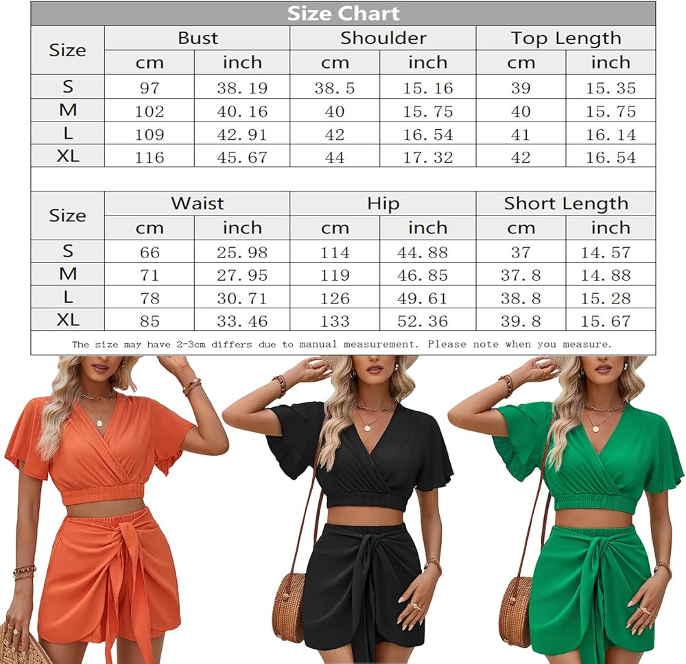 المزايا: طقم نسائي قصير مكون من قطعتين للصيف، طقم صالة علوي قصير برقبة على شكل حرف V، مجموعات قصيرة بأكمام قصيرة مكشكشة، مجموعات قصيرة متطابقة مرنة عالية الخصر، طقم قصير ملفوف من قطعتين، أفضل لإظهار منحنياتك.
