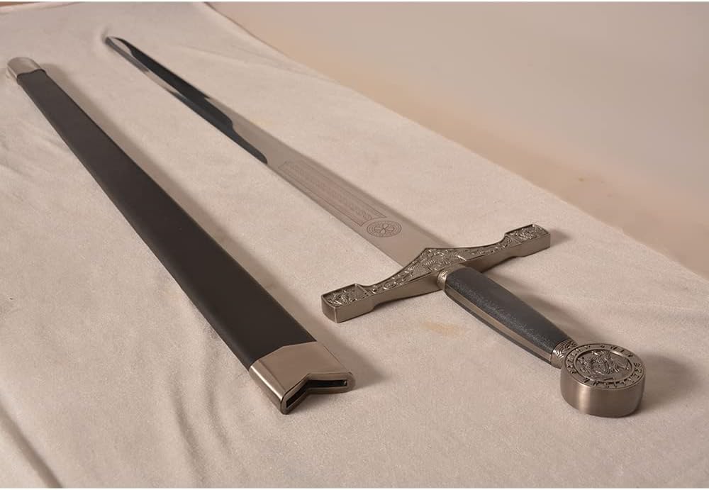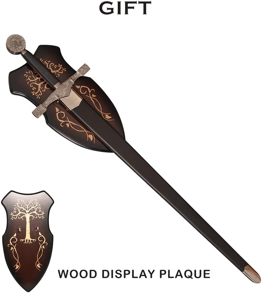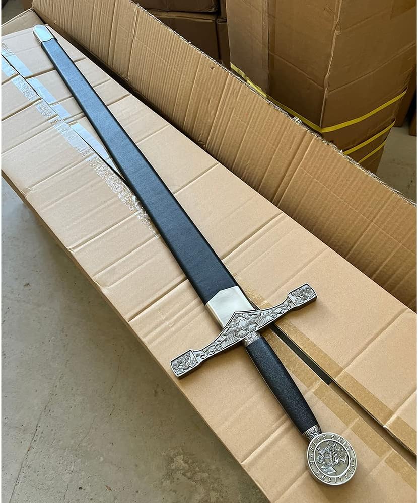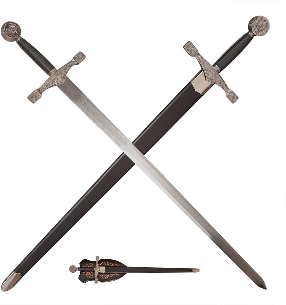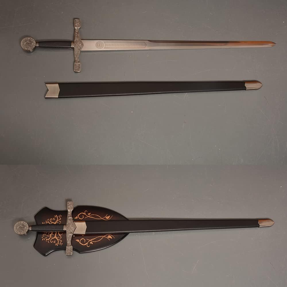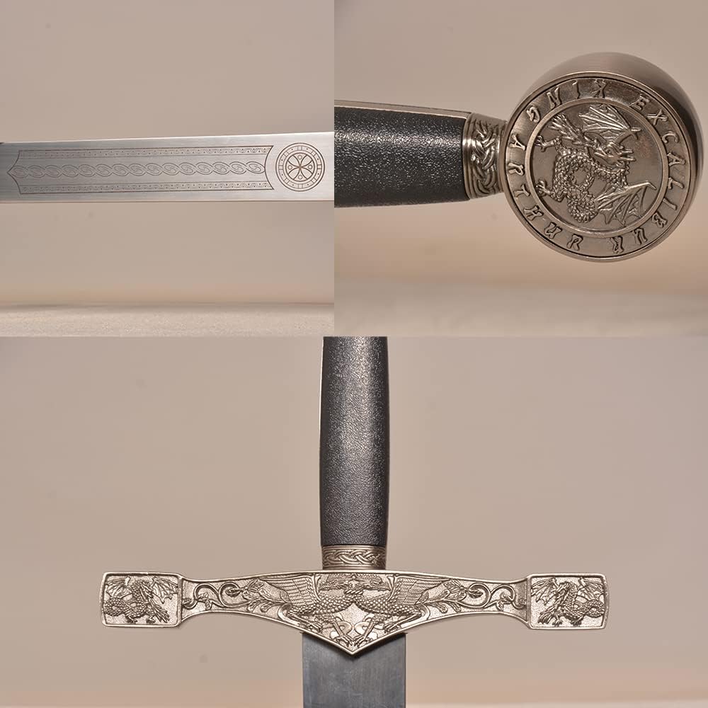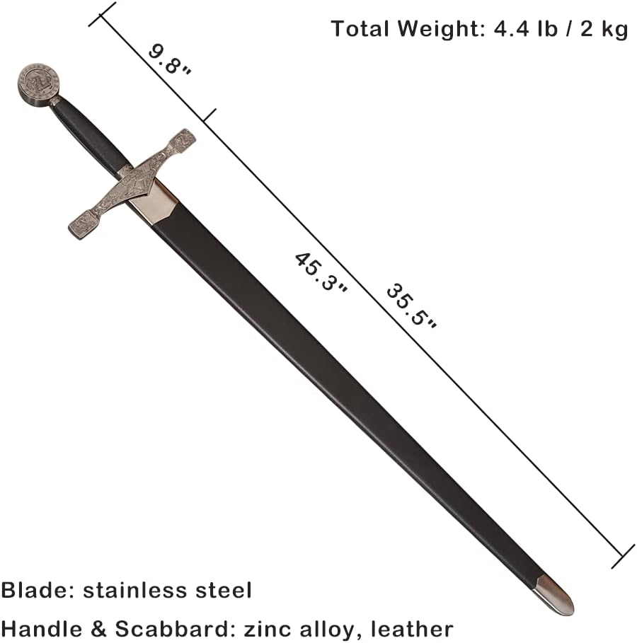 【Specification】Total Length with Scabbard:43.5 in; Handle: 9.8 in; Blade: 35.4 in; Total Width: 9.3 in; Blade Width: 1.8 in; Total Weight: 4.4 lb / 2 kg 【Material】Blade: stainless steel; Handle & Scabbard: zinc alloy, leather. Please note that the blade is NOT sharp. 【Application】You can use it for collection, cosplay, display and so on. 【Design】The blade is etched with unique patterns, and the pommel has the word "King Arthur Excalibu r" and a dragon motif. The guard also has a beautiful dragon design. 【After-Sales】If you have any questions about the product, we will get back to you within 24 hours