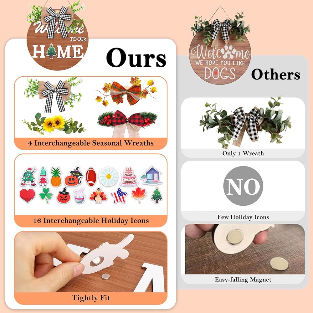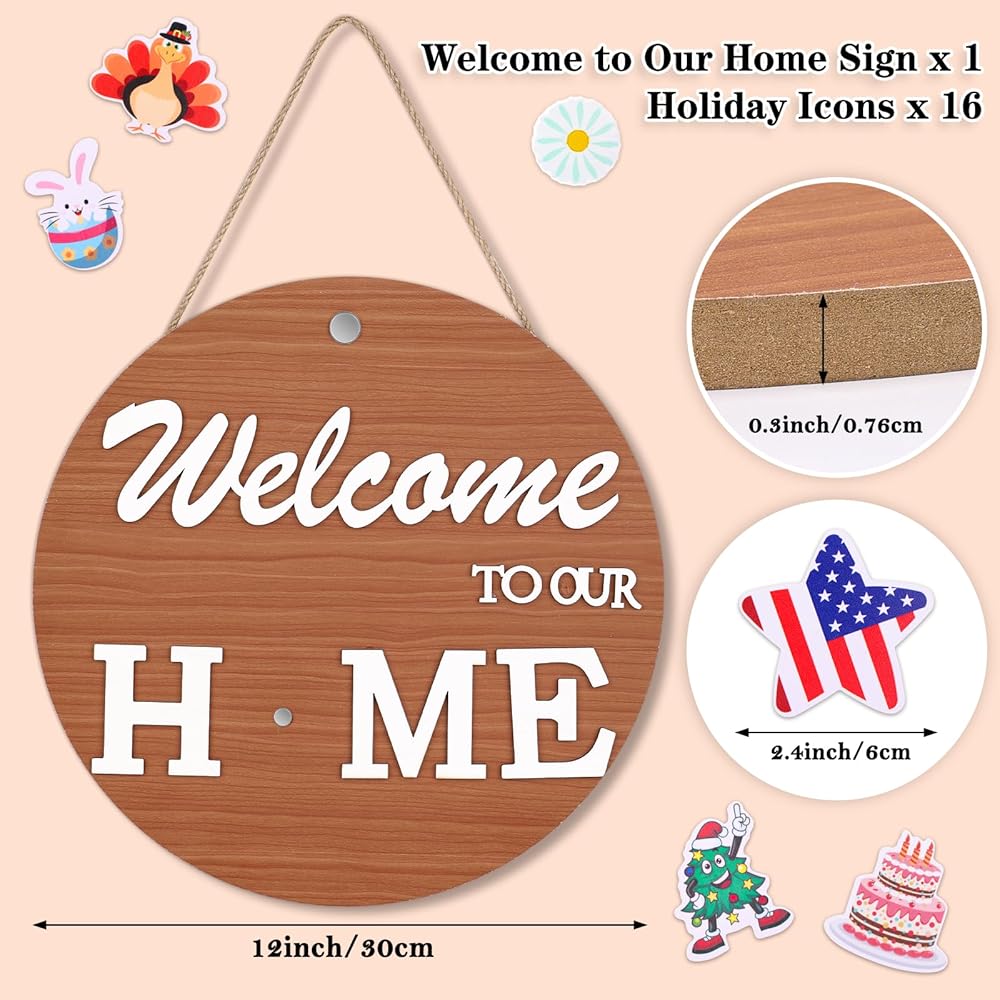 • Seasonal front door welcome sign: The seasonal welcome wreath for front door decoration with all seasonal styles wreaths and 17 holiday icons such as star flag, heart, chick, maple leaf, cake, football, pumpkin, sun and Xmas tree, you can create a different atmosphere by changing them.