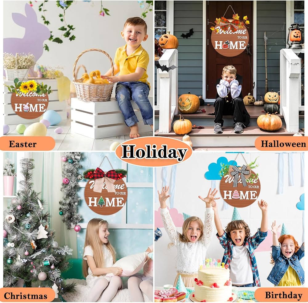 • Design: Our welcome sign with skilled craftsmanship. Artificial greenery, 3D letters welcome home design and various holiday icons make this wooden door hanging sign look cute and pretty.