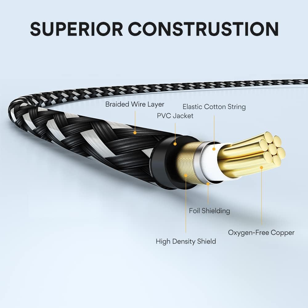 • ✅حماية متعددة الطبقات: كابلات الصوت عبارة عن حماية من 5 طبقات، وسترة منسوجة من قماش التويد باللون الرمادي الأسود، ومحمية من مادة PVC موصلة سميكة للغاية، وطبقة حماية مضفرة OFC مضادة للتداخل مع تغطية 95%، وطبقة ألومنيوم مضادة للتداخل، وحبل قطني قابل للشد.