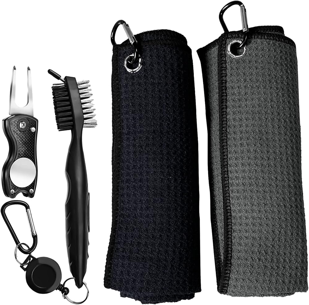 مجموعة مناشف الجولف مكونة من 4 | منظف أخدود فرشاة نادي الجولف | أداة ديفت قابلة للطي مع علامة كروية مغناطيسية | مناشف الجولف بنمط الوافل، حل إصلاح النادي القذر وDivot