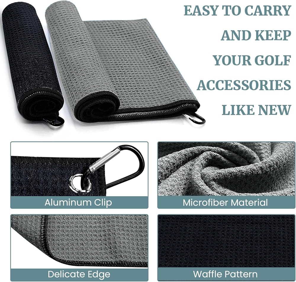 【مناشف جولف بنمط وافل】أزرق، رمادي، أسود، 3 ألوان كلاسيكية يمكن أن تتناسب مع حقيبتك والنادي والفريق المفضل. يعتمد على تصميم نمط الوافل الذي يساعد على تنظيف الأخاديد بشكل أسرع وأكثر شمولاً أثناء محاصرة الأوساخ والحطام. مشبك حلقة تسلق متين يزيل أي قلق بشأن سقوط المنشفة من حقيبتك أو عربة التسوق.