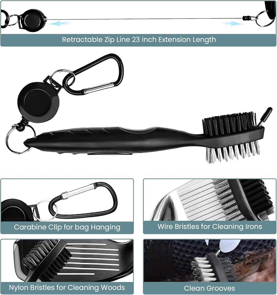 【منظف أخدود برؤوس فرشاة مزدوجة】شعيرات نايلون لإزالة الغبار وقصاصات العشب من وجوه نادي الحديد أو الخشب. شعيرات سلكية لإزالة الأوساخ والطين العنيدة من سطح الحديد. أداة تنظيف الأخدود مع غطاء أمان تزيل الأوساخ من الأخاديد ونعال الجولف. حلقة تسلق بخط سحاب قابلة للسحب تجعل من السهل ربطها بحقيبة الجولف الخاصة بك، خفيفة الوزن وقابلة للحمل.