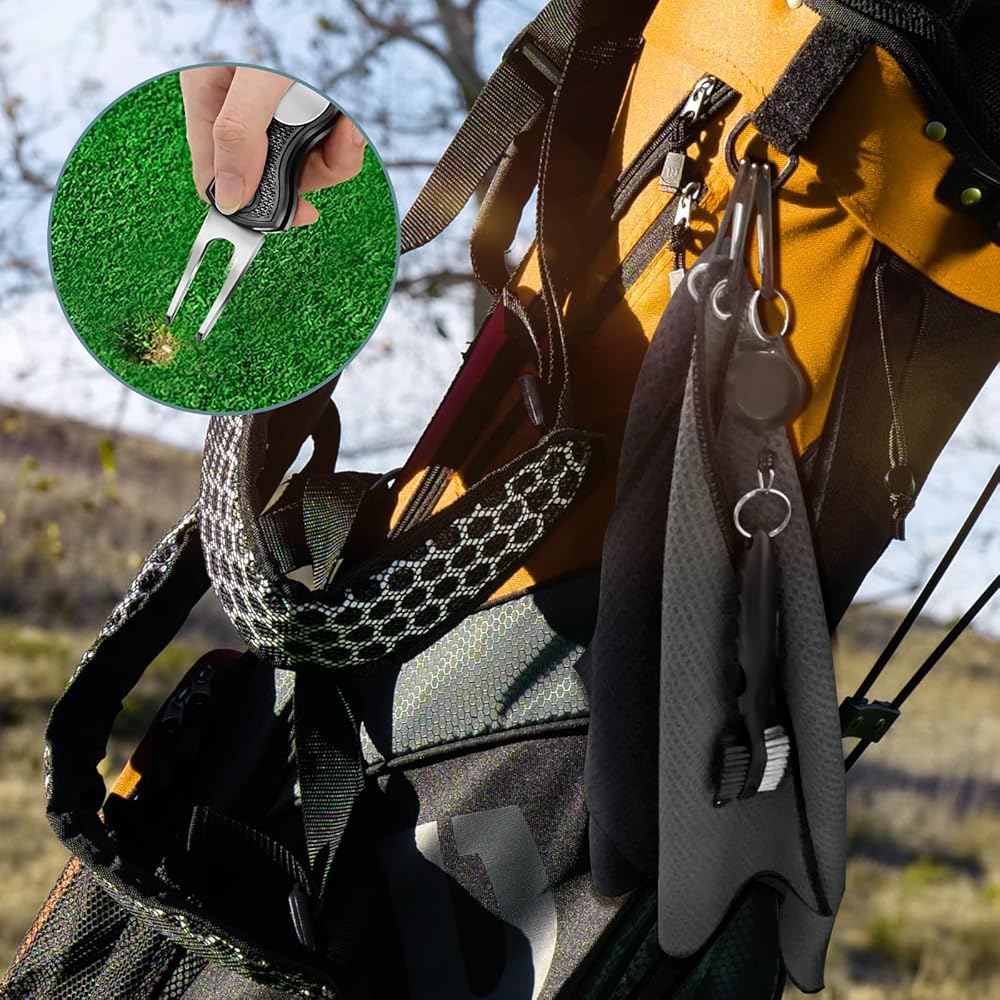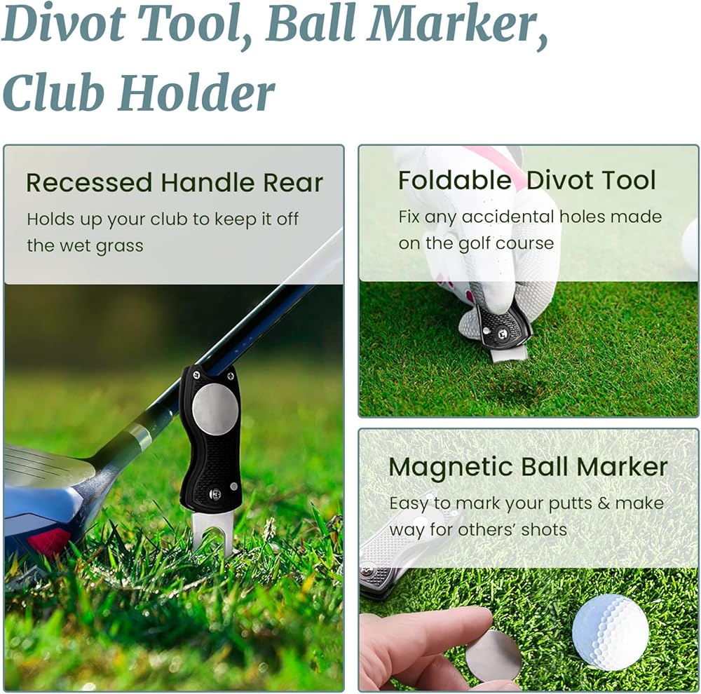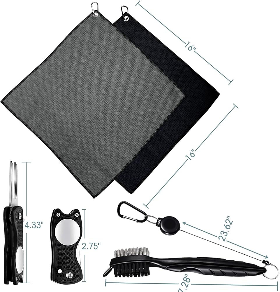 【مجموعة ملحقات تنظيف الجولف】3 × منشفة جولف من الألياف الدقيقة، 1 × منظف أخدود فرشاة الجولف، 1 × أداة إصلاح ديفت. مجموعة التنظيف MAGIC GOLF مثالية لتنظيف نادي الجولف، وتنظيف المسامير، والمكواة الرائدة، وأوتاد الرمل، وأدوات التدريب، وأوتاد الفصوص، والموظفين، والأخاديد وأحذية الجولف لإزالة الأوساخ والعشب. تساعد مجموعة أدوات تنظيف الجولف على الحصول على أداء أفضل في لعب الجولف.