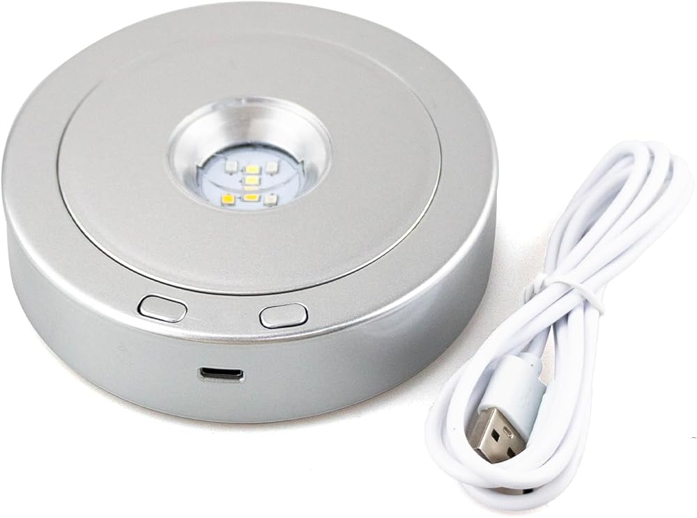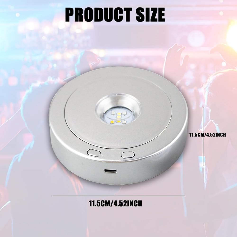 【Easy to Use】This LED light base rotating platform has two buttons, the left side controls the light, the right side controls the rotation, long press to turn it off, there are four different rotation speeds including clockwise, counterclockwise, fast and slow