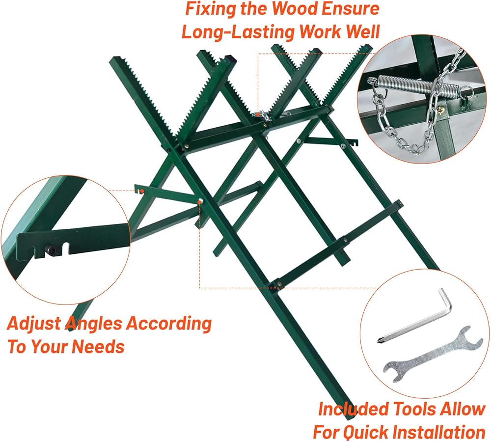 • مجموعة واسعة من التطبيقات: سواء كنت حطابًا محترفًا أو ببساطة من عشاق الحطب، فإن هذا الحصان المتين ومتعدد الاستخدامات ضروري لجميع احتياجات قطع الخشب الخاصة بك.