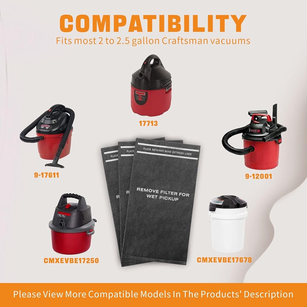 9-38737 wet dry vac filter bags, compitiable with most Craftsman 2.5 gallon shop vac filters vacuums: CMXEVBE17250, 9-17611, 9-12001,9-17713, 177135 and Powerhead Bucket Vac CMXEVBE17678. Part# CMXZVBE38737 38737 9-38737.