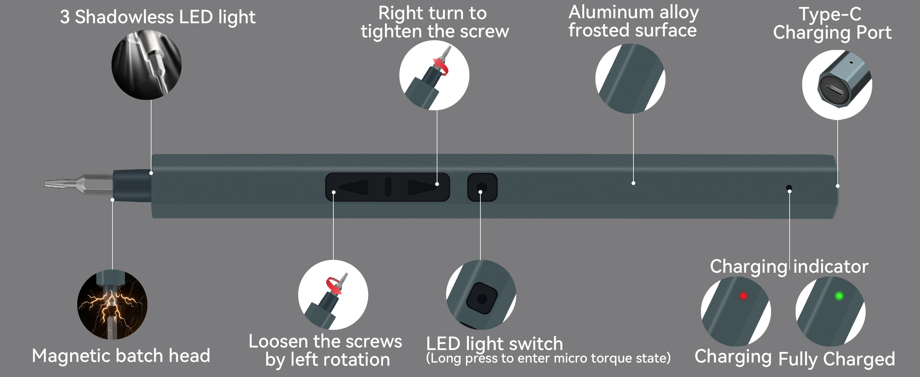 【تصميم مريح】يتميز مفك البراغي الأوتوماتيكي الخاص بنا بتصميم مريح، وسطح بلوري من سبائك الألومنيوم، وقبضة مريحة وموثوقة، ويمكنه بسهولة التعامل مع المعدات المعقدة دون التسبب في تعب اليد.