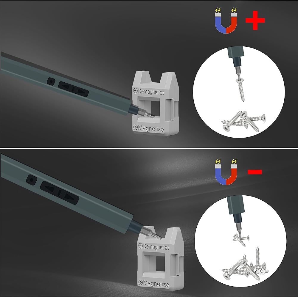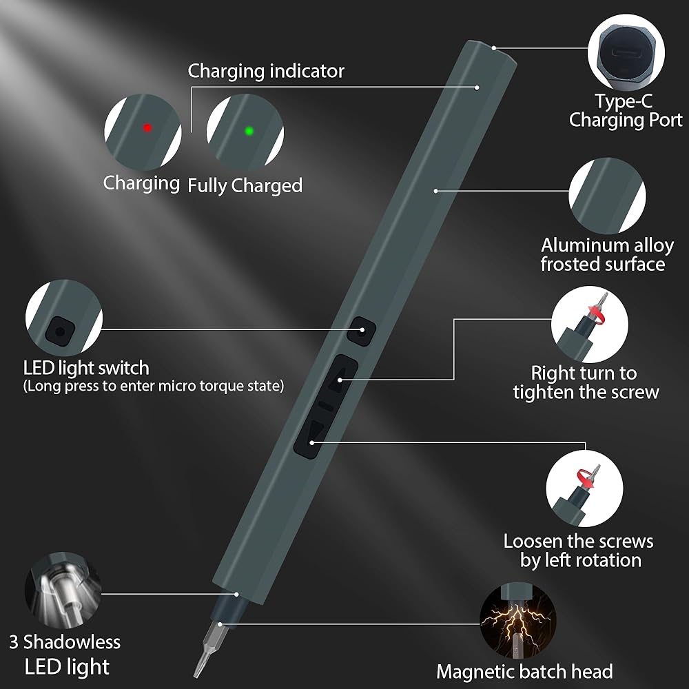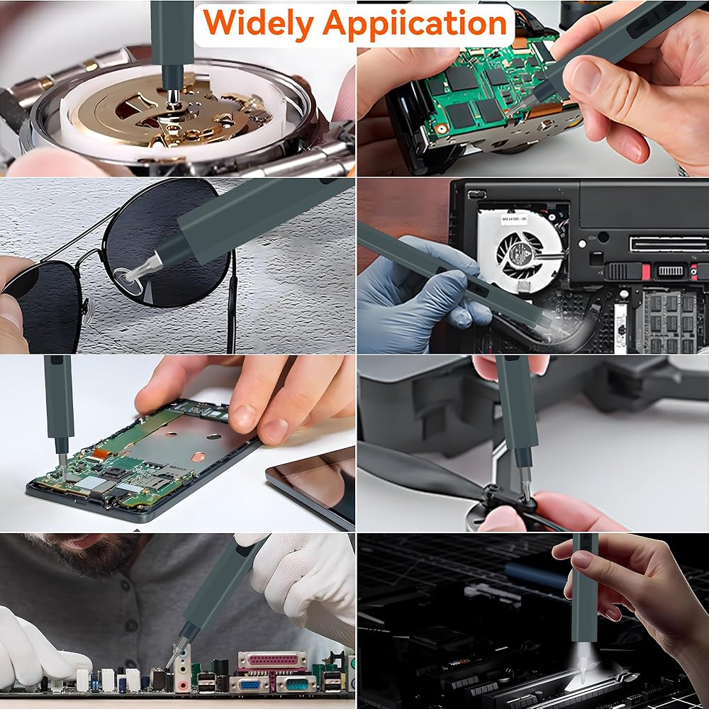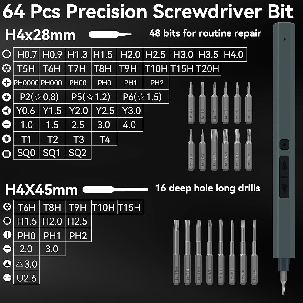 【مفك براغي دقيق مع ضوء LED】مع 64 لقمة مثقاب دقيقة، بما في ذلك طولين مختلفين لتلبية احتياجاتك في الفتحات العميقة. مجهزة بـ 3 مصابيح LED بدون ظل، يمكن ملاحظتها في البيئات الخافتة لضمان التشغيل الدقيق.