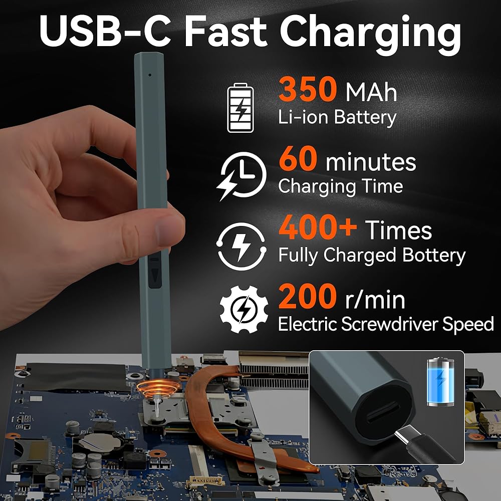【شحن سريع】يحتوي مفك البراغي الكهربائي هذا على بطارية مدمجة قوية قابلة للشحن بقوة 350 مللي أمبير في الساعة يمكن شحنها بالكامل في أقل من ساعة واحدة، مما يوفر عمر بطارية قويًا لأكثر من 400 برغي في المرة الواحدة.