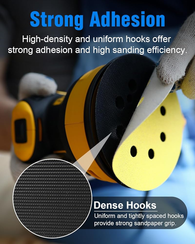 • التصاق قوي - تتميز وسادة استبدال ماكينة الصنفرة المدارية مقاس 5 بوصات بملحق خطاف وحلقة متقاطع عالي الكثافة، مما يضمن التصاق ورق الصنفرة بقوة على الوسادة. وهذا يمنع التحول أو الدوران أثناء الصنفرة، مما يضمن الحصول على نتائج صنفرة دقيقة ومتسقة.