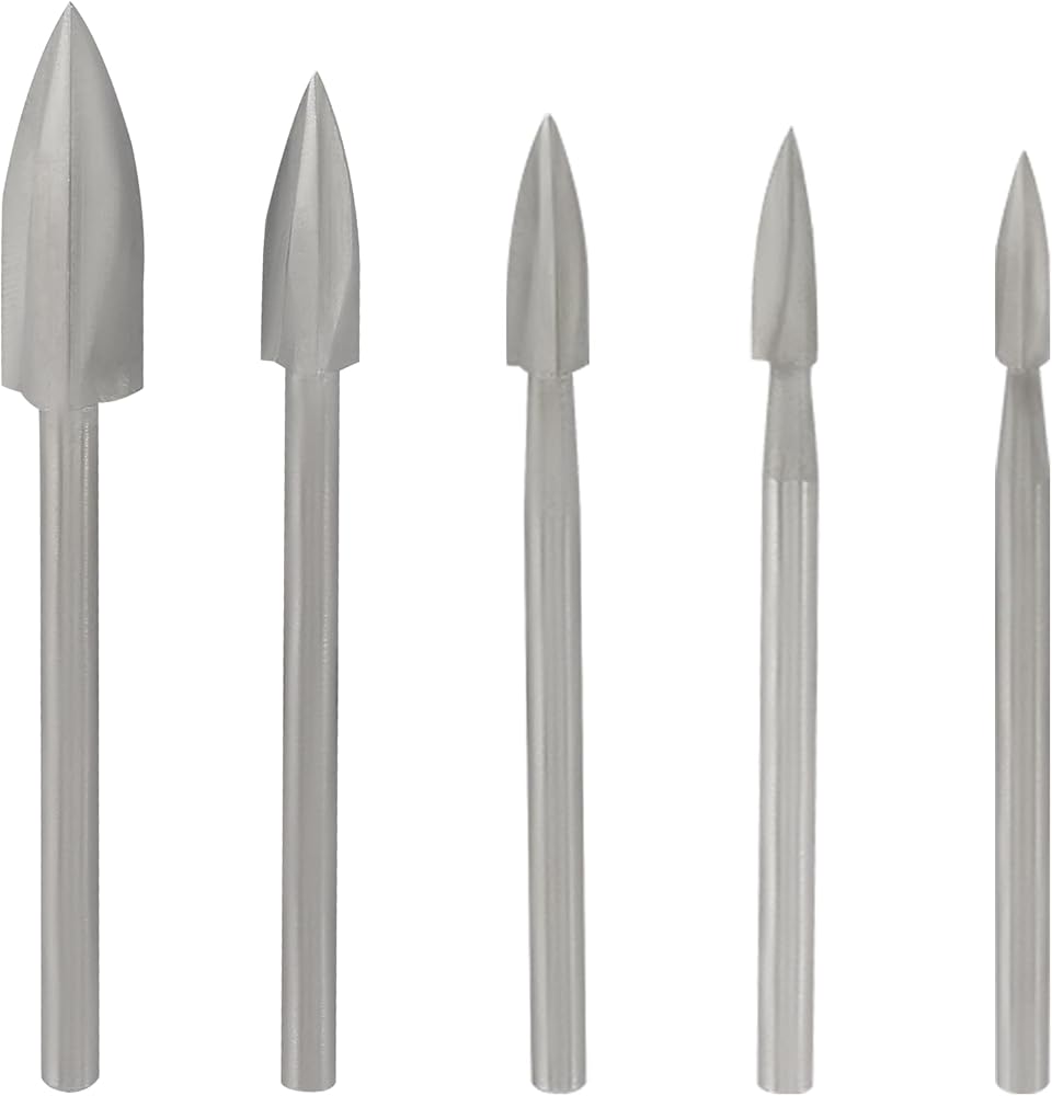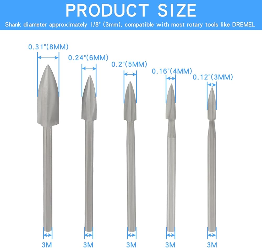 High-Quality Wood Carving Drill Bit Set: Each set includes 5 pieces of wood carving drill bits in different diameter sizes (3mm, 4mm, 5mm, 6mm, 8mm), compatible with most micro rotary tools with a 1/8-inch (3mm) shank.