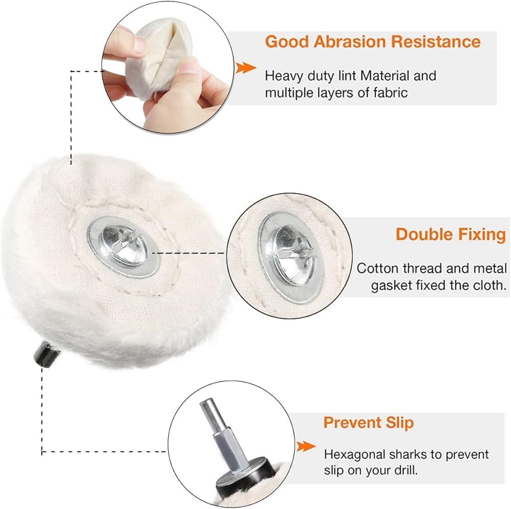 Polishing wheels shanks are round continued with hex shape so they will not slip off when in use.
