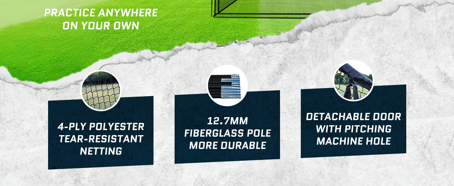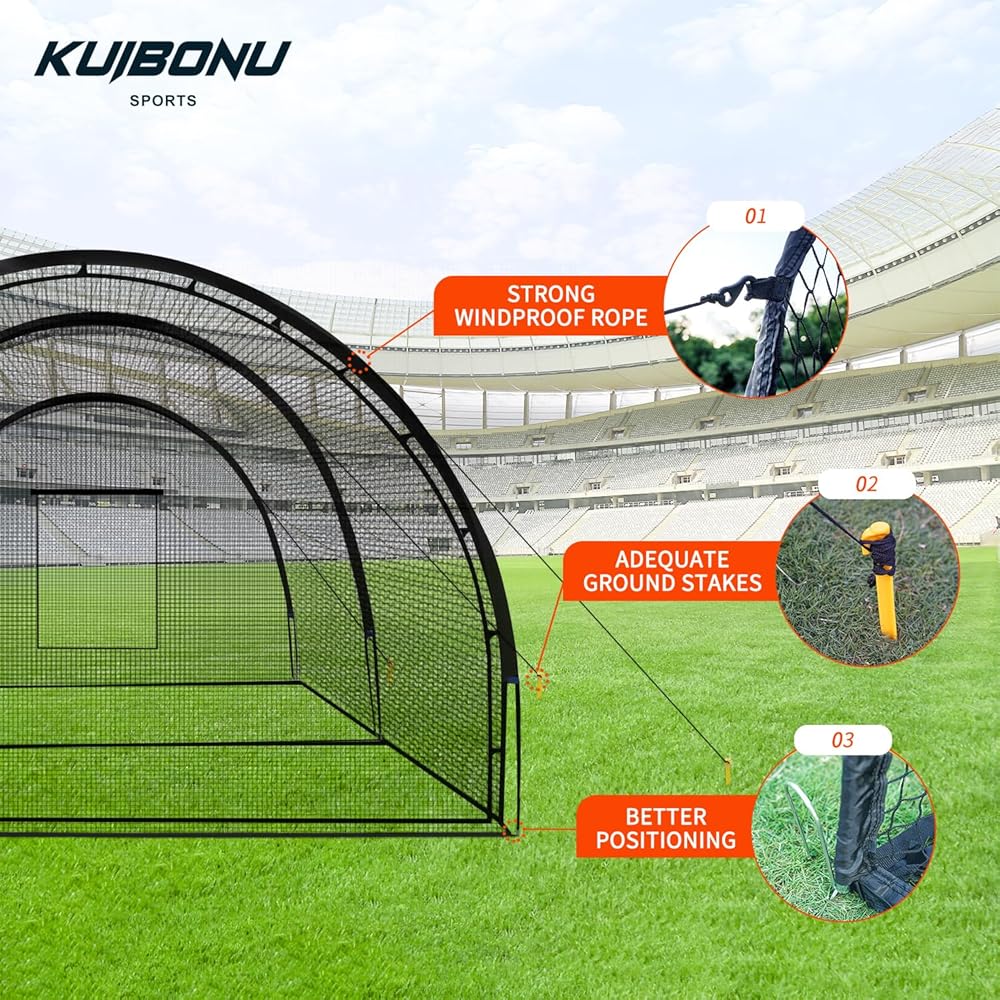 • ⚾️أعمدة دعم أقوى وأكثر سمكًا: أعمدة من الألياف الزجاجية عالية القوة مقاس 12.7 مم تمنع الكسر، و8 حبال مقاومة للرياح مع أوتاد أرضية يمكن أن توفر الثبات أثناء الاستخدام. يعتبر قفص البيسبول KuiBonu خيارًا رائعًا لممارسة الضرب والرمي في الفناء الخلفي.