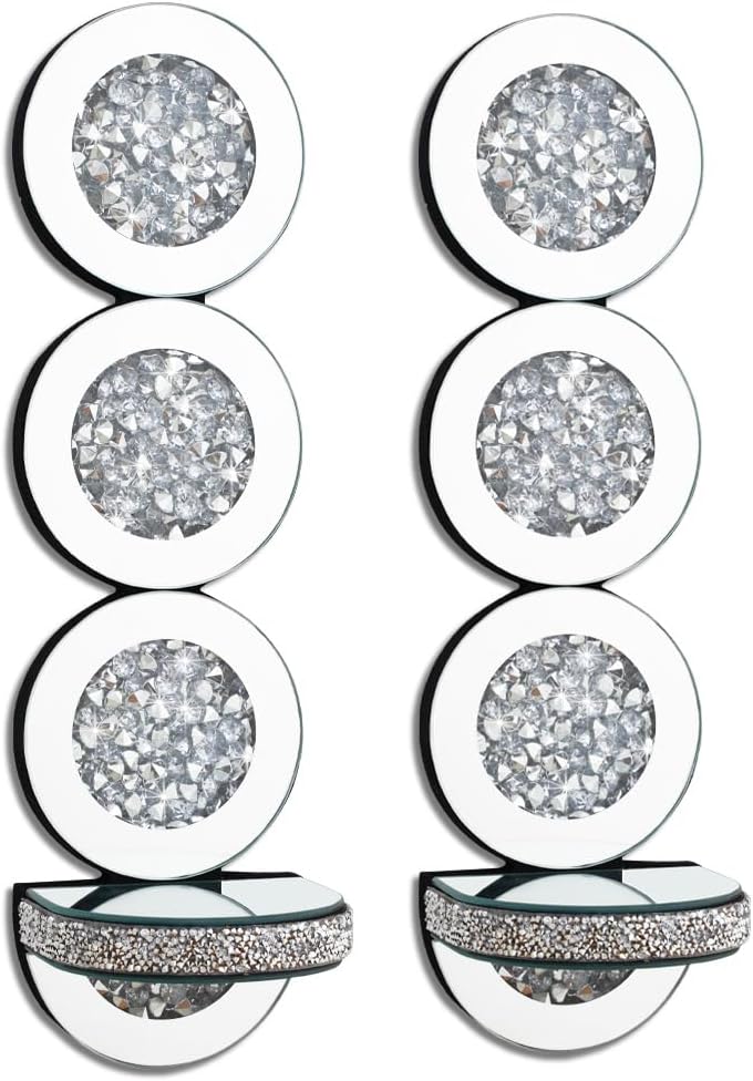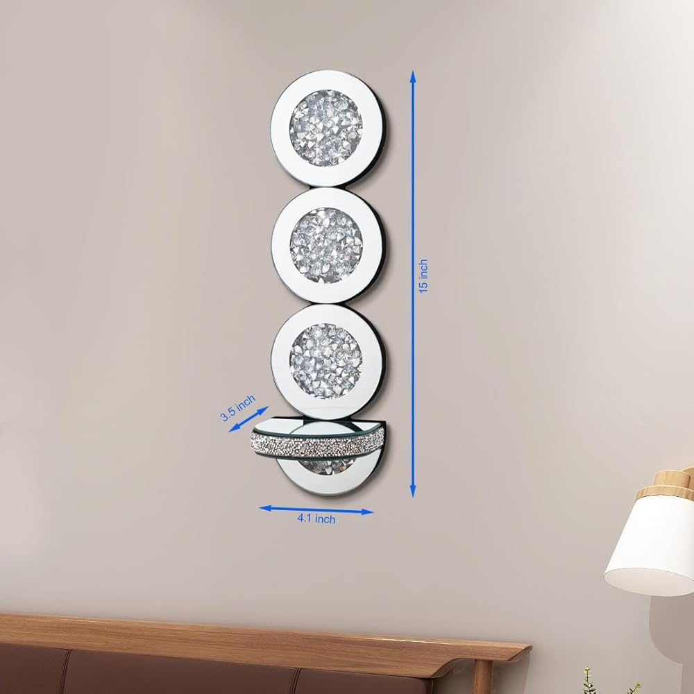 • لمسة تزيينية: مرآة فضية مشطوفة ذات شكل دائري من الألماس المصقول ورف شفاف كريستالي توفر مظهرًا جذابًا للغاية للعائلة، طراز عصري رائع يناسب مجموعة متنوعة من الديكورات الداخلية للمنزل. ديكور أنيق مثالي لتزيين الجدران، طراز آرت ديكو. الأفضل للإهداء.