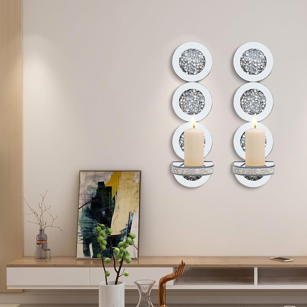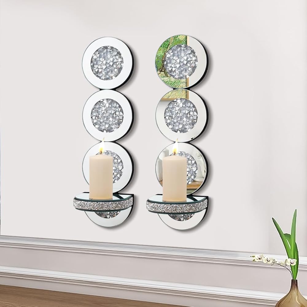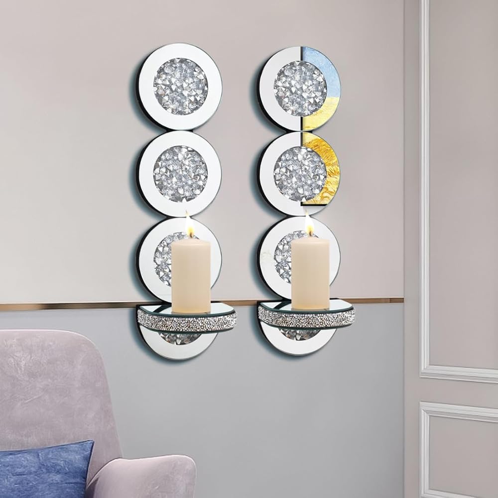 شمعدانات شموع عاكسة من كريستال كراش دايموند، مجموعة حامل شموع فضية اللون مكونة من قطعتين، ديكورات جدارية لغرفة المعيشة، غرفة الطعام (دائرية)