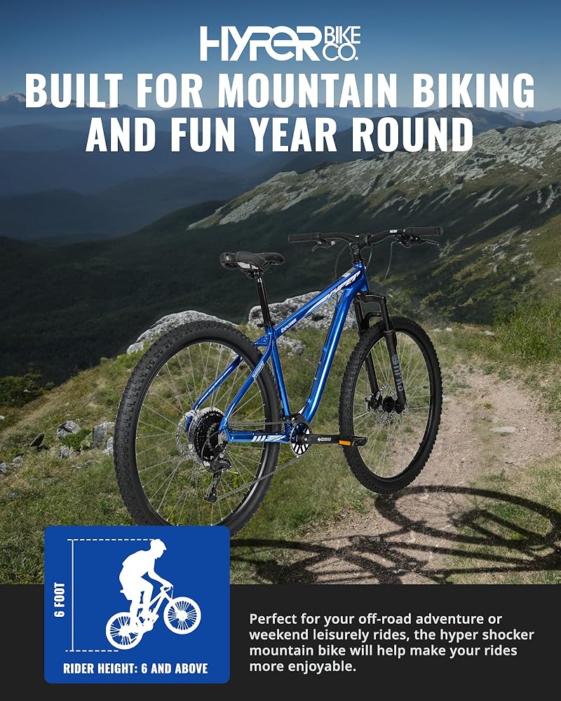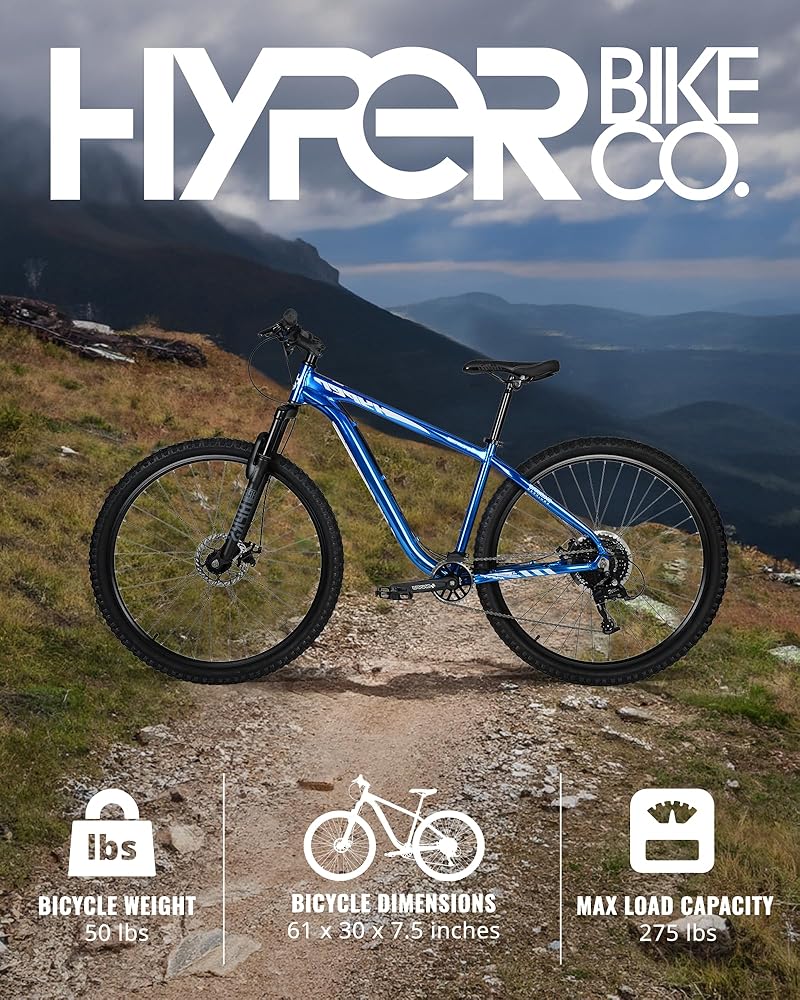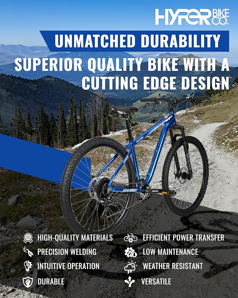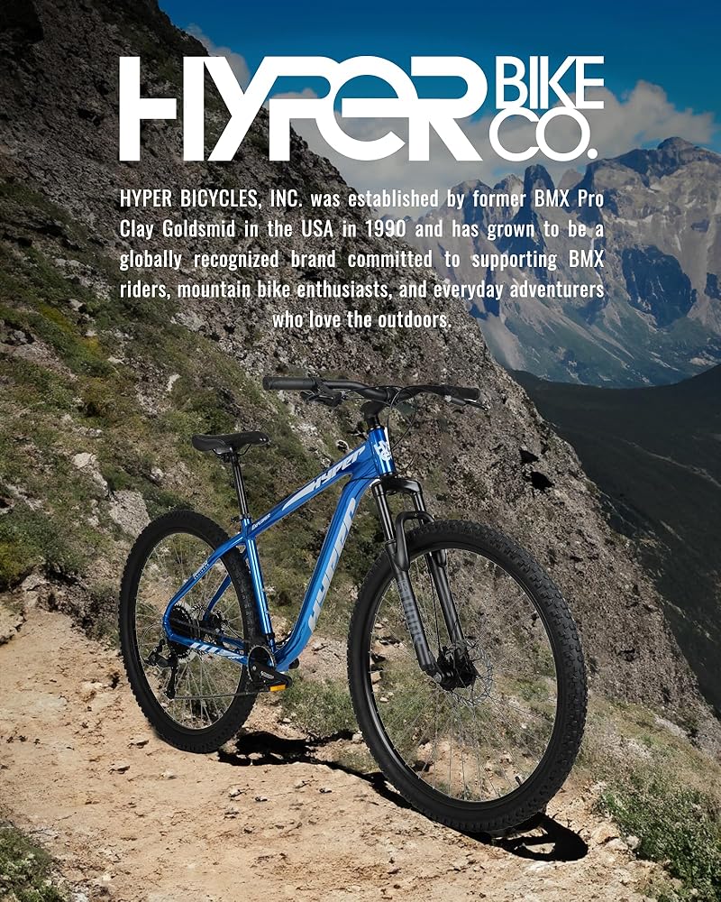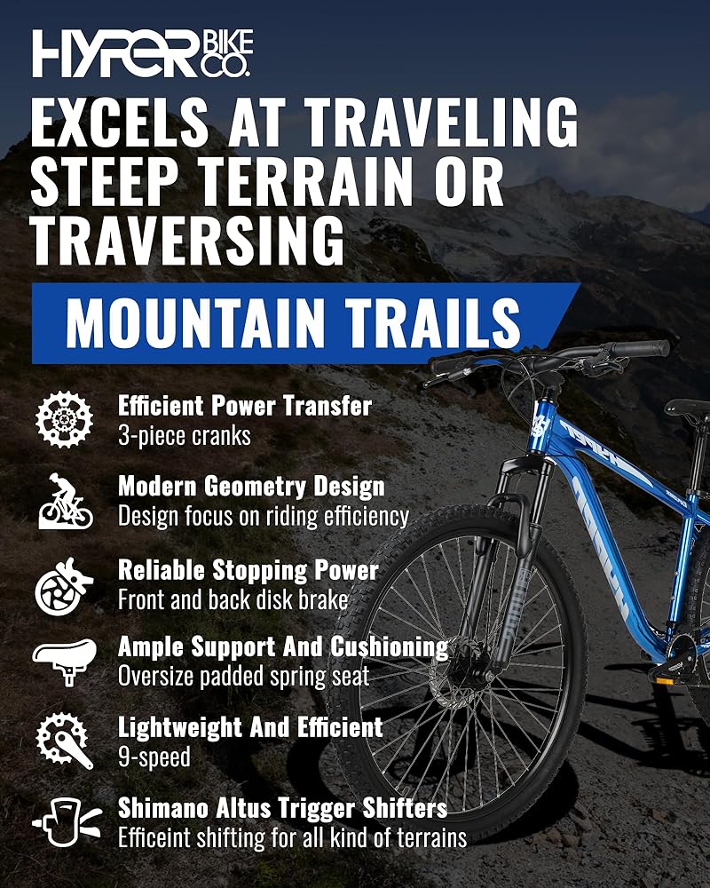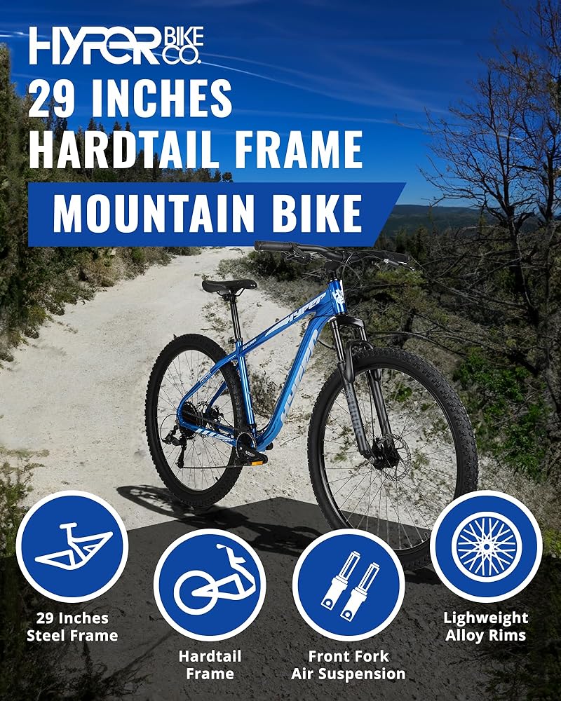 دراجة جبلية هايبر للرجال والنساء مقاس 29 بوصة. دراجة تريل مع مبدلات سرعة شيمانو 9 وإطار دراجة MTB خفيف الوزن من الألومنيوم. الدراجة الجبلية للسيدات والرجال. إكسبلورر (أزرق)