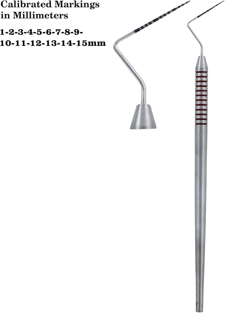 The UNC15 Probe is designed to assess periodontal pocket depths, attachment levels, anatomy configurations, and gingival bleeding. Measures the sulcus or pocket depth of the periodontium of each tooth. The working end has calibrated markings in millimeters. Features: Made of high-quality stainless steel 1-2-3-4-5-6-7-8-9-10-11-12-13-14-15mm