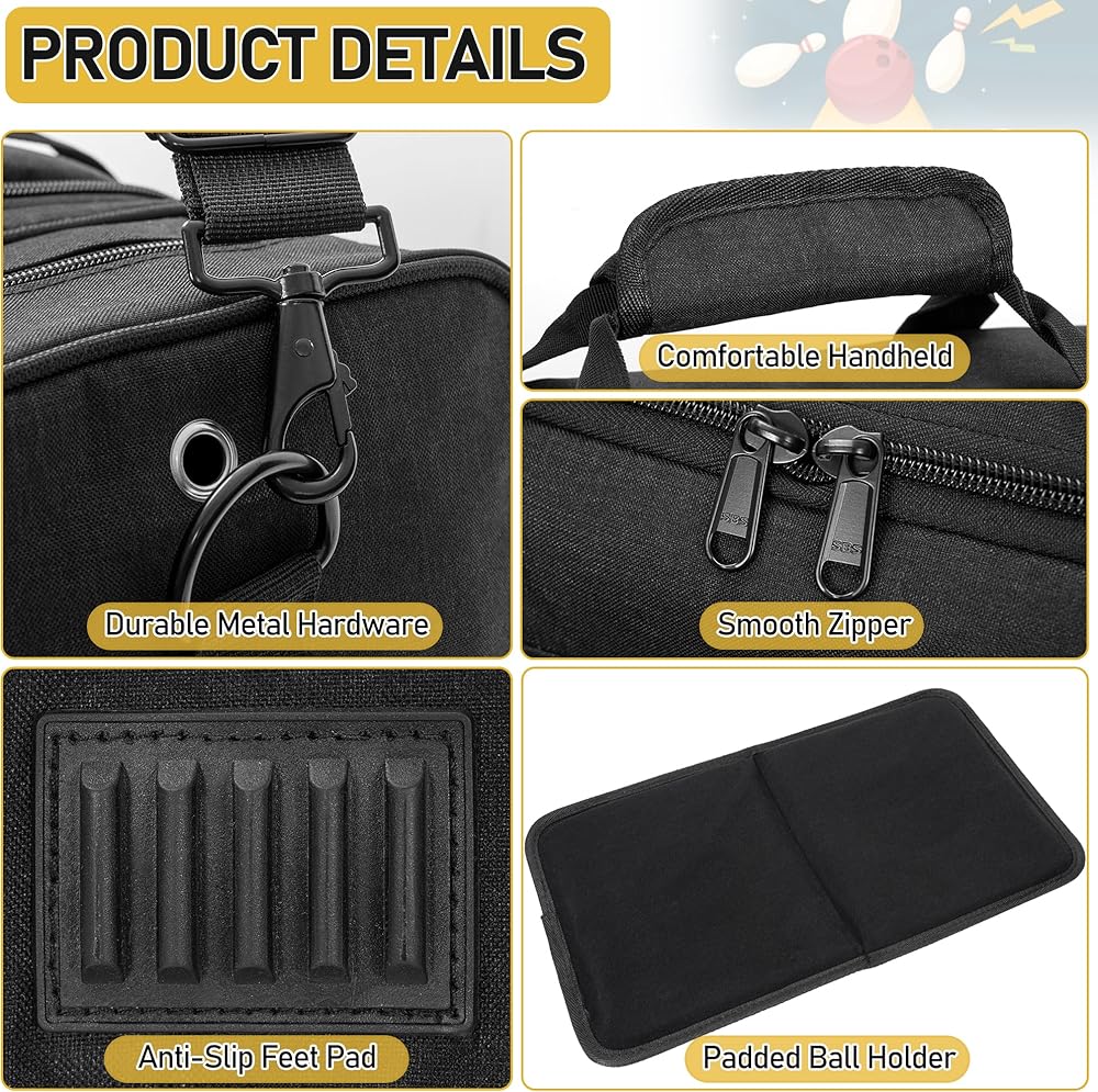 • 【Padded Bowling Ball Holder】The main compartment is equipped with a thickly padded, foam bowling ball holder with reinforced sturdy bottom to cushion and protect your bowling ball from damage. Besides, there are 4 anti-slip feet pad under the bag to provide stability and reduce wear.