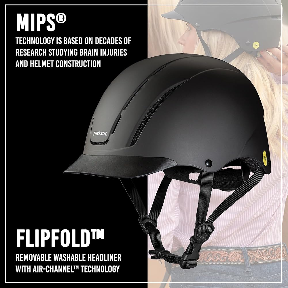 Troxel Spirit MIPS Duratec Horseback Riding HelmetMips technology is based on decades of research studying brain injuries and helmet construction, making it a state-of-the-art protection system featured in helmets across a wide range of activities: horse riding, snowboarding, snow skiing, cycling, motorsports and rock climbing.Low profileFull-coverage design for optimal comfortMaximum airflow vent placementFlexVisor; DialFit systemFlipFold removable washable headliner with Air-Channel technologyASTM/SEI-certifiedProduct Number : 54036The #1 riding helmet keeps getting better. Spirit offers a deeper, full-coverage fit for incredible comfort and security, a low-profile design, and DialFit technology that all work together to create the most comfortable fit for a variety of head shapes. And now, Spirit comes with the added protection of Mips technology. Spirit also offers an array of fun, fashionable graphics and colors!